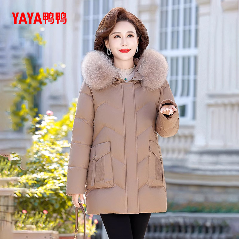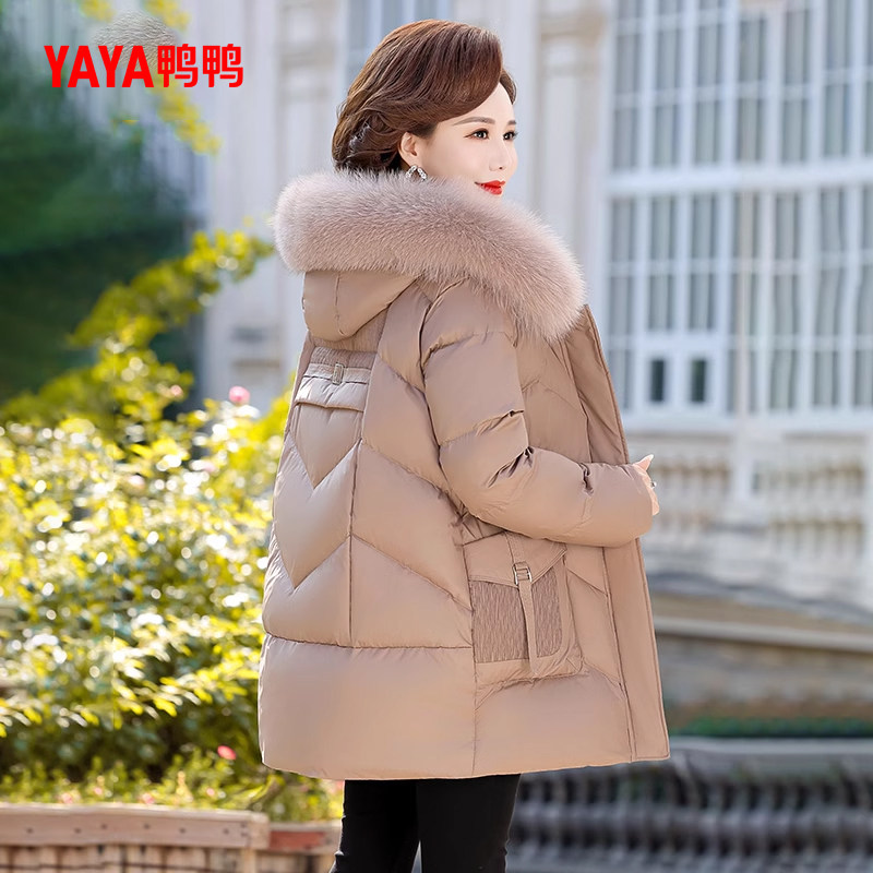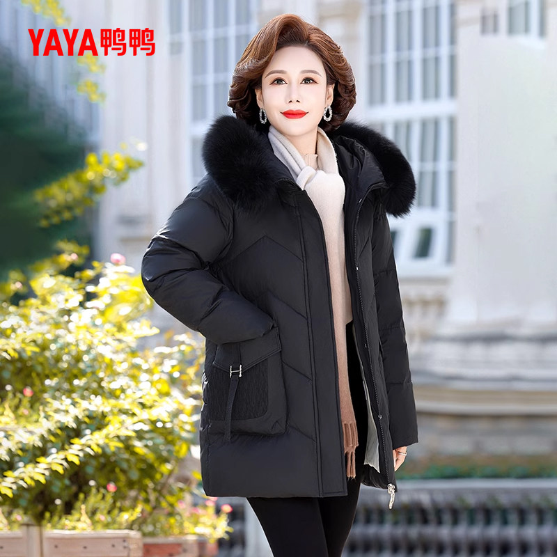 鸭鸭羽绒服女2025冬季新品连帽狐狸毛领中长款保暖妈妈中老年外套