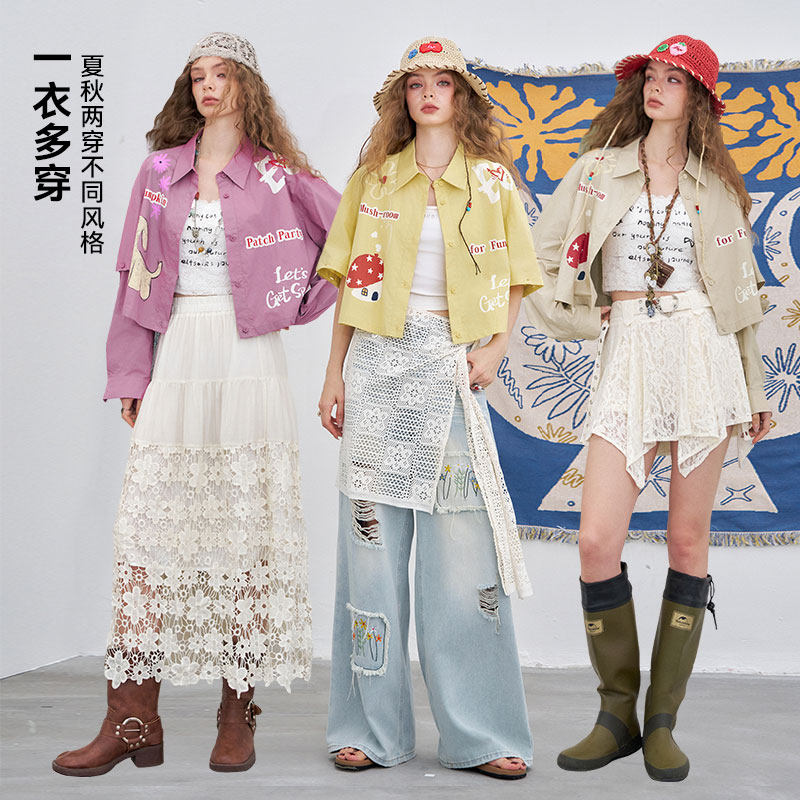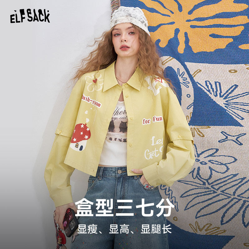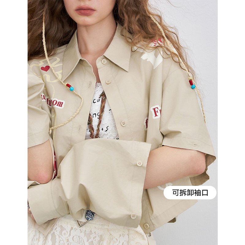 妖精的口袋原创印花短款衬衫女2026年春夏新款可拆卸长袖休闲上衣
