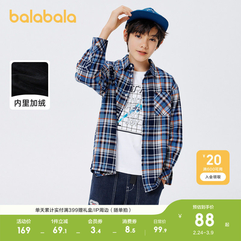 巴拉巴拉童装男童衬衫长袖加绒中大童格子印花衬衣洋气上衣潮休闲