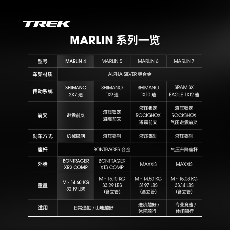 TREK崔克MARLIN 4轻量缓震碟刹14速越野山地自行车