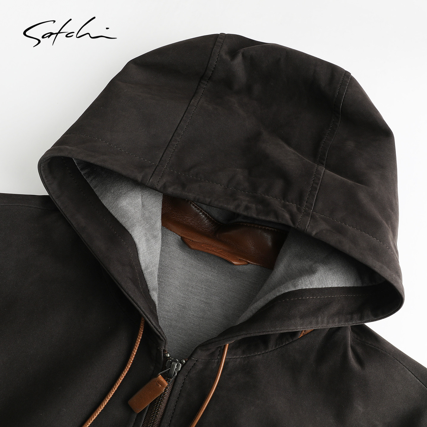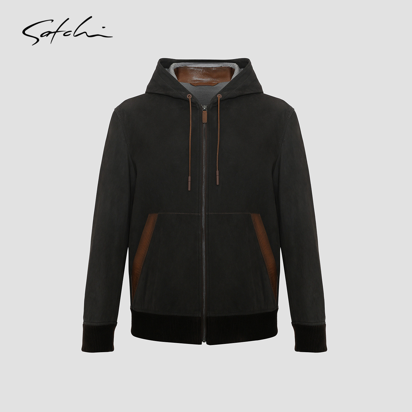 [牛皮革]SATCHI沙驰男装男士真皮皮衣休闲复古连帽撞色皮夹克外套
