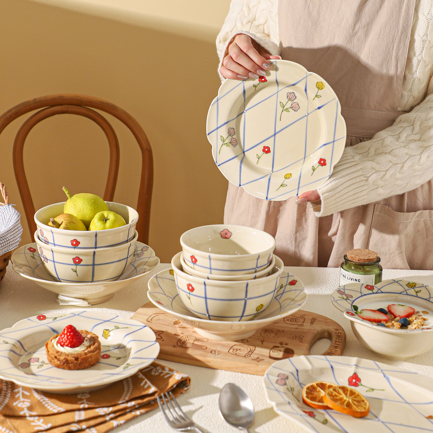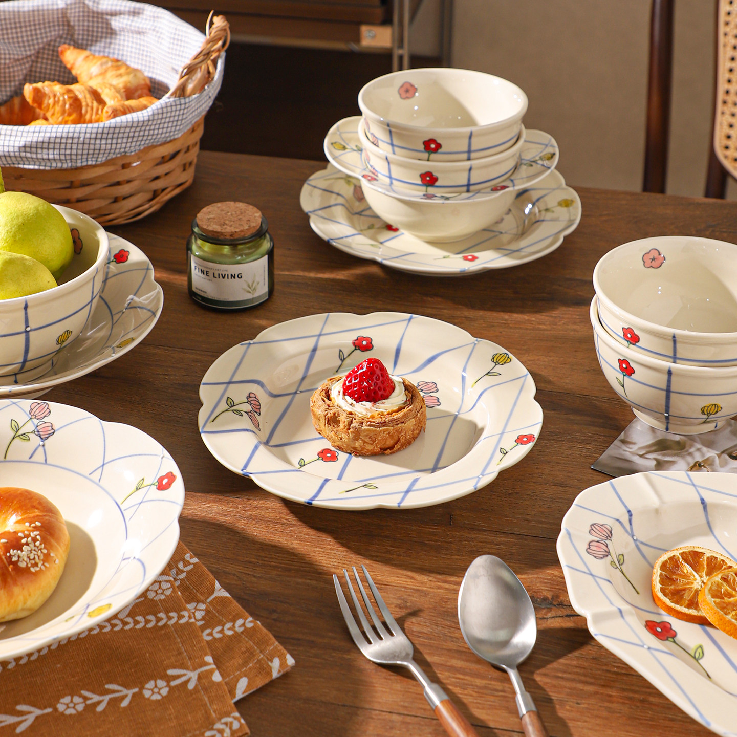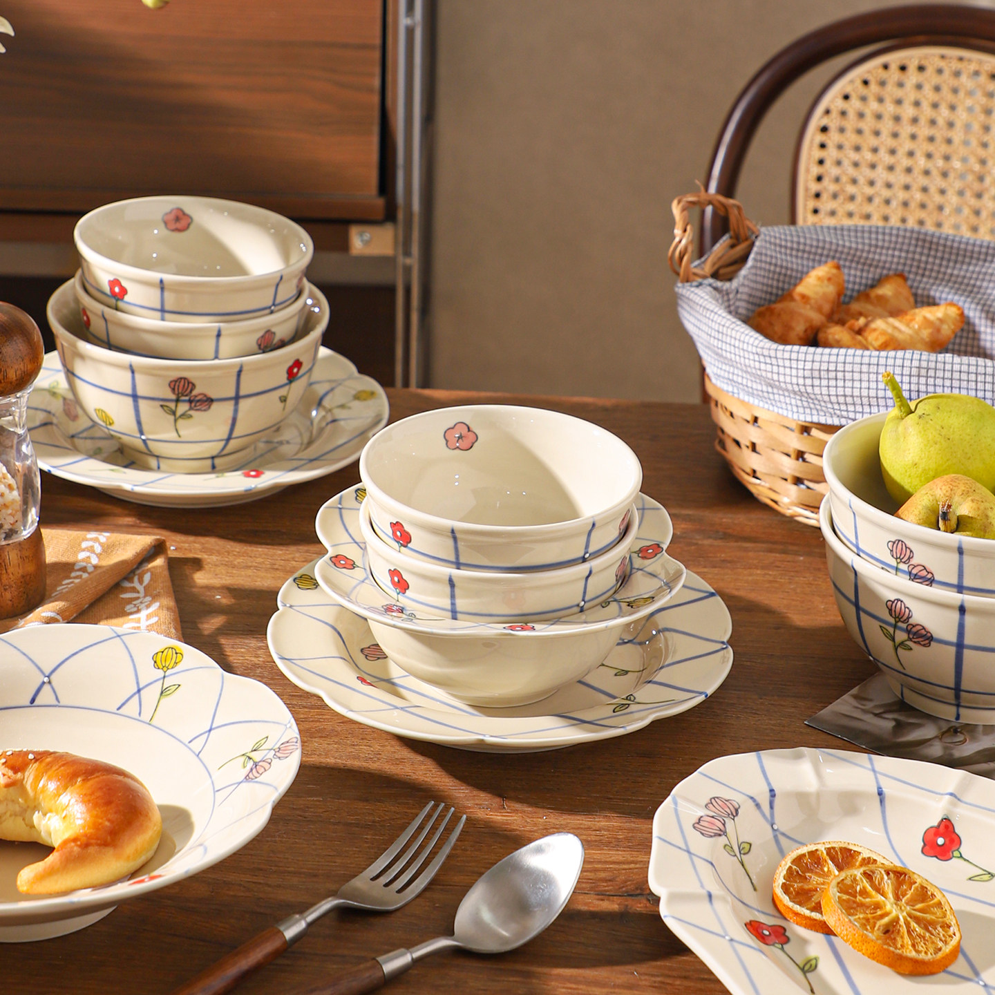 舍里法式花朵陶瓷碗碟套装家用碗盘餐具釉下彩米饭碗炒菜盘鱼盘子