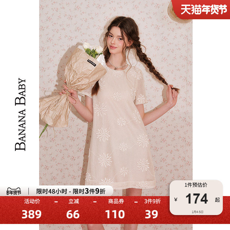 BANANA BABY2025年新款千金风刺绣连衣裙女圆领甜美减龄短裙子