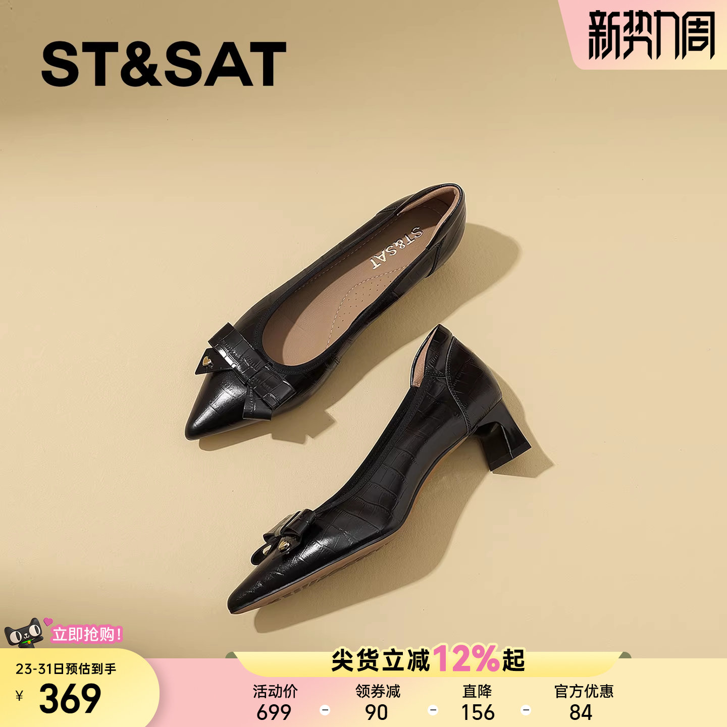 星期六真皮百搭通勤工作鞋女2026春季新款尖头粗跟配裙子浅口单鞋
