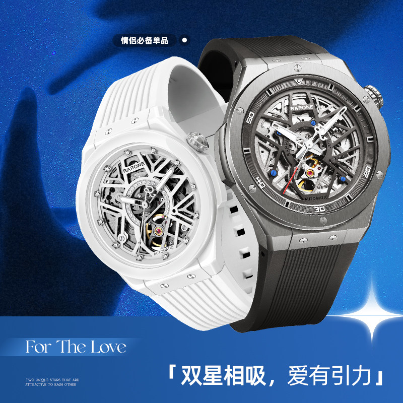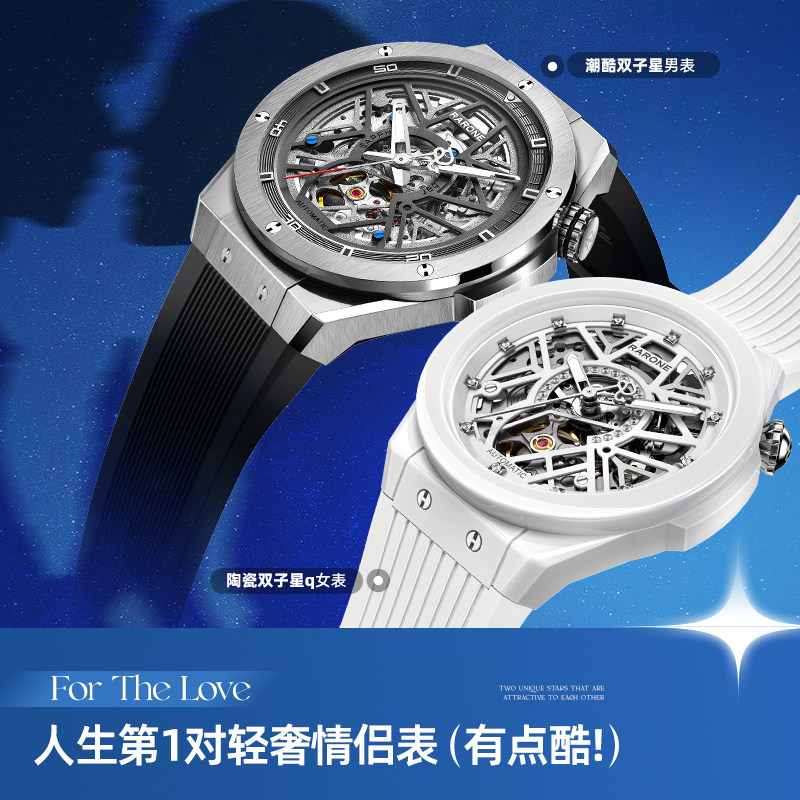 【圣诞礼物】Rarone雷诺双子星情侣手表男女对表镂空自动机械腕表