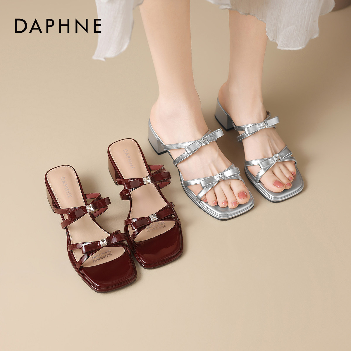 达芙妮红色凉鞋女款2026新款法式复古高跟鞋夏季一字凉拖银色拖鞋