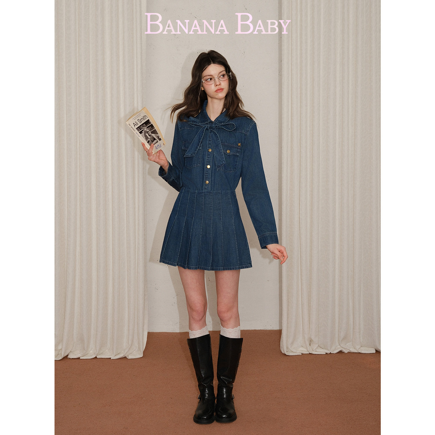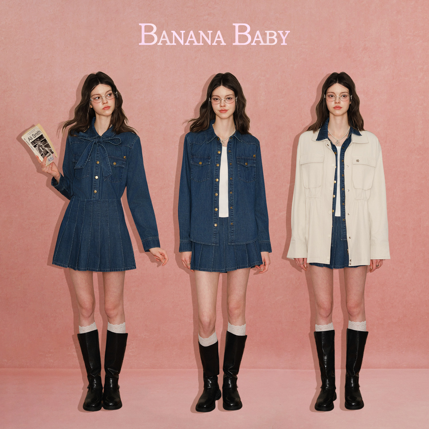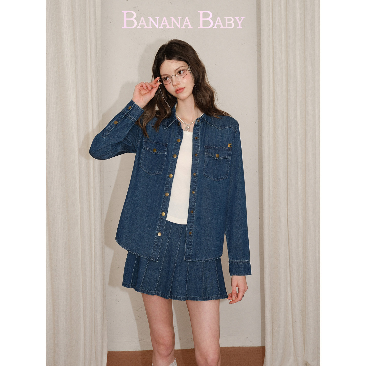 【莱赛尔】BANANA BABY2026年春季新款复古牛仔衬衫百褶裙女套装