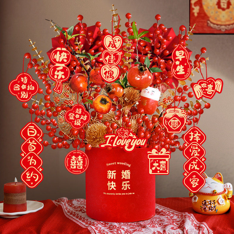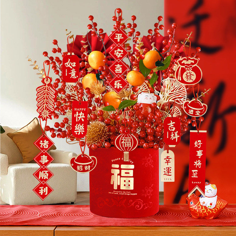 春节福桶结婚客厅装饰摆件仿真花插花新婚礼物乔迁花束新居马年