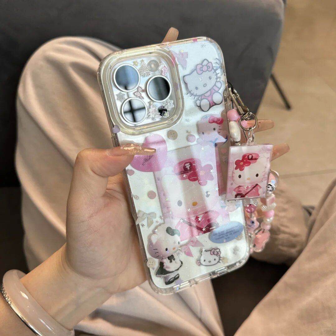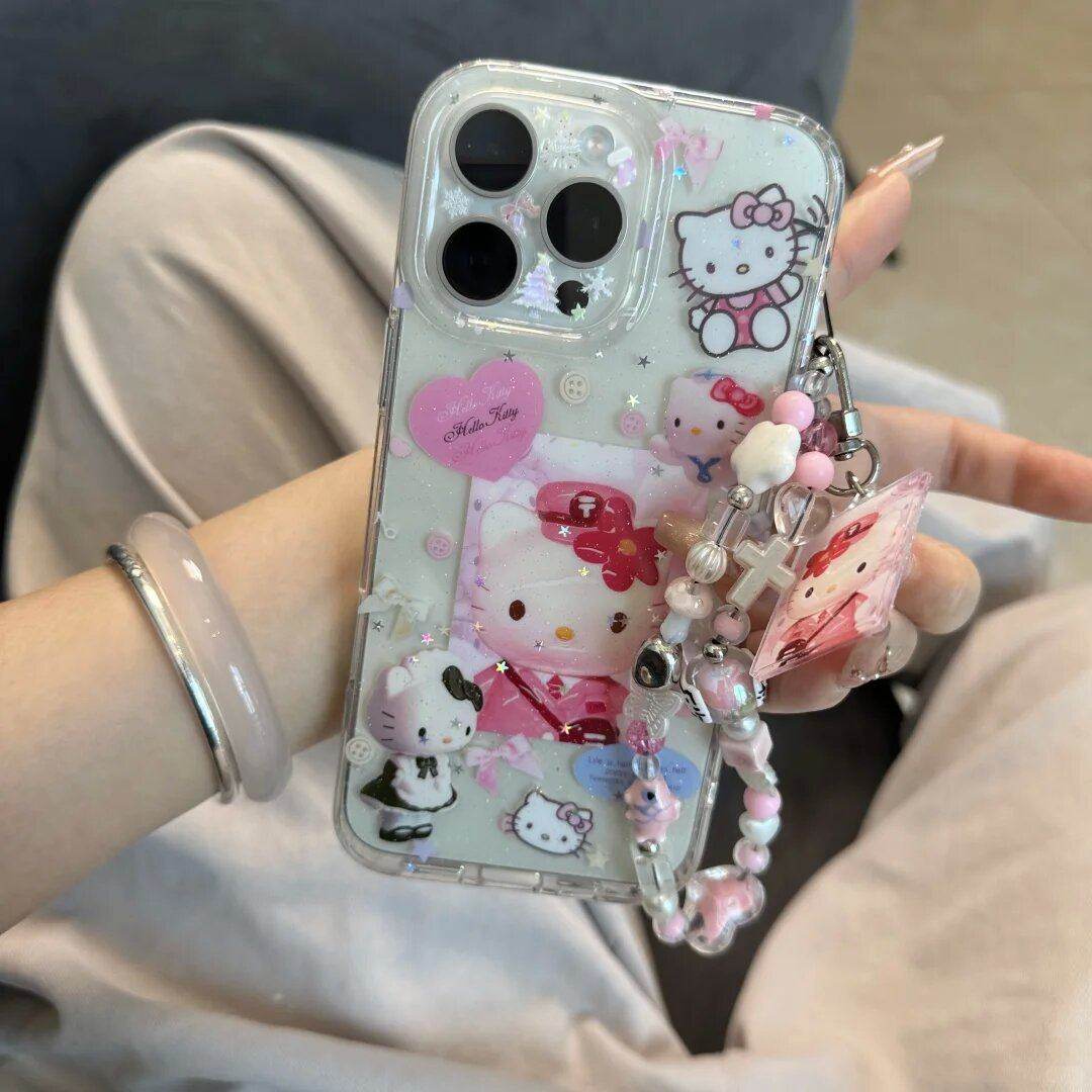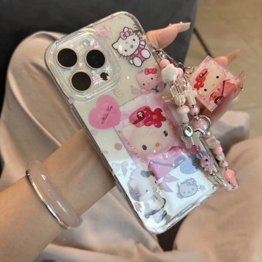 可爱闪粉半透制服kt猫手机壳适用于苹果16promax穿制服的kt猫挂件链条15pro满屏少女心拼接14/13防摔保护套