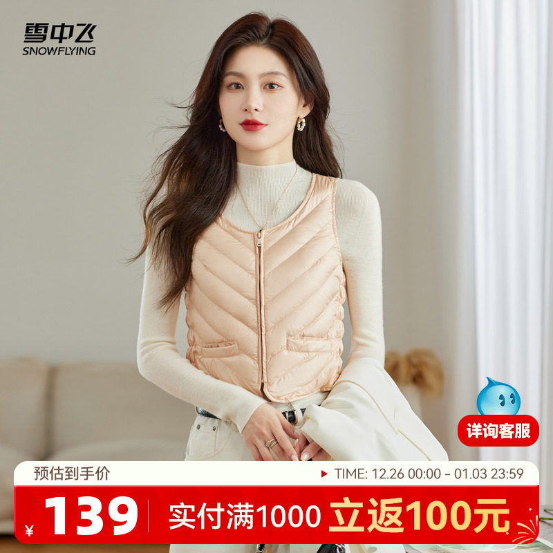 雪中飞25冬新款女士短款轻薄花边圆领羽绒马甲背心纯色百搭舒适W