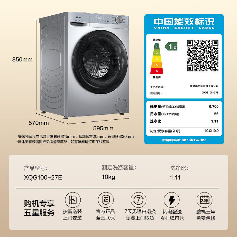 【补贴15%】海尔10公斤全自动家用变频一级1.1洗净比滚筒洗衣机
