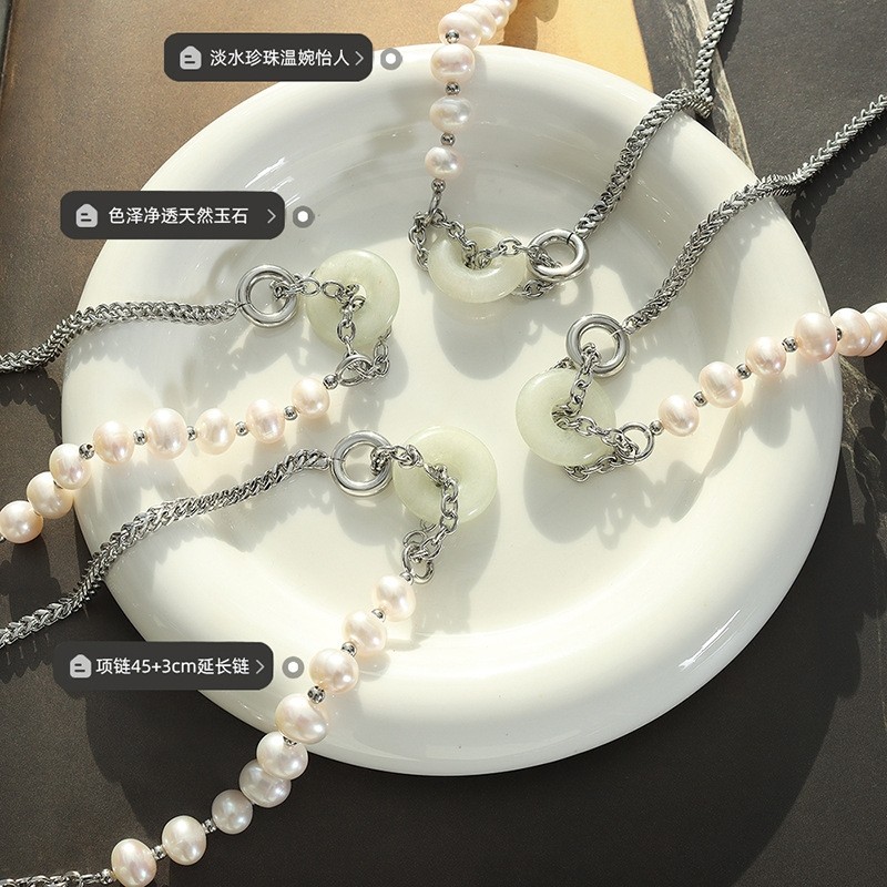 个性民族风天然淡水珍珠项链中国风玉石吊坠钛钢粗链条锁骨链首饰