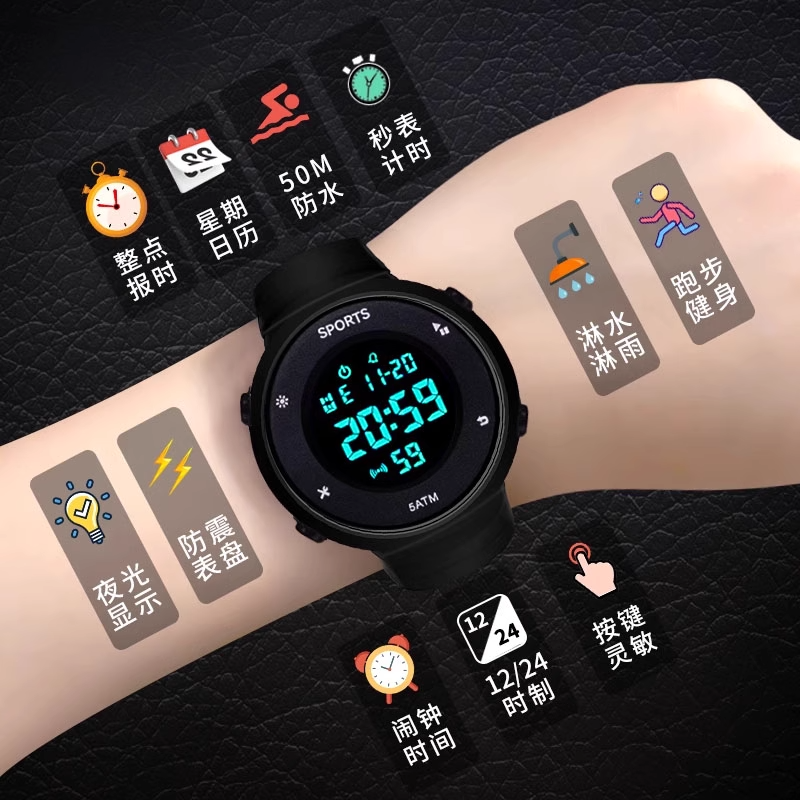 电子手表男初高中学生女无声震动闹钟静音儿童运动只看时间考试环