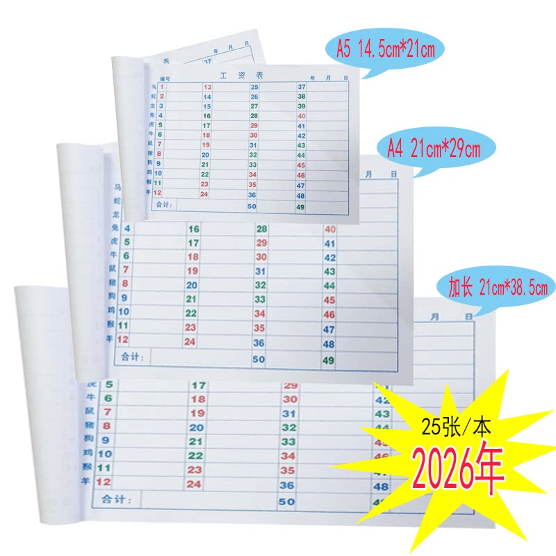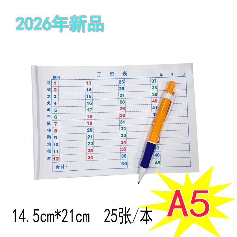 2026年生肖 A4/A5六合用本带生肖六彩49格50行工资表彩色码单本