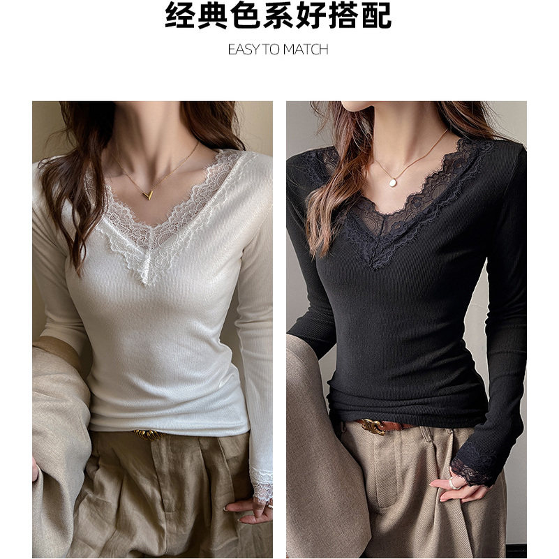 倩牛精选】法式纯欲蕾丝V领正肩显瘦内搭打底衫女秋冬辣妹修身