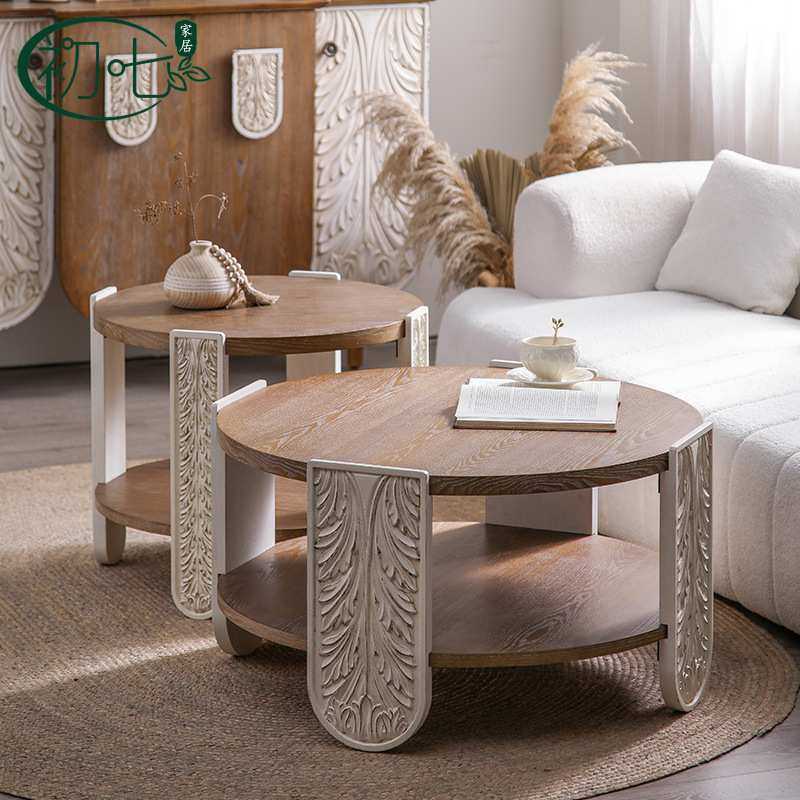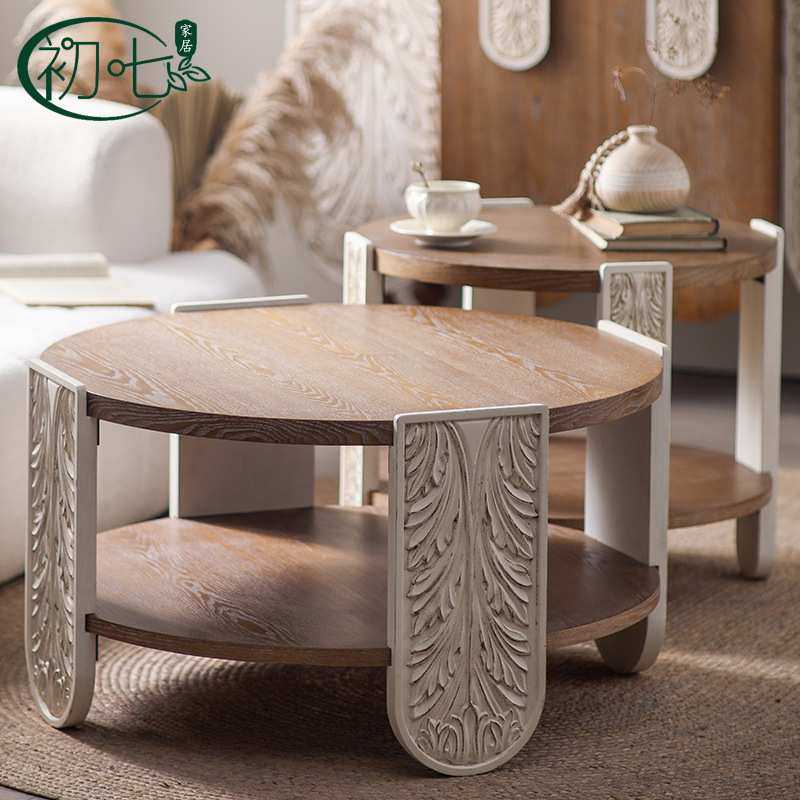 美式乡村实木雕花茶几小户型民宿客厅茶桌宫廷风复古做旧阳台边几