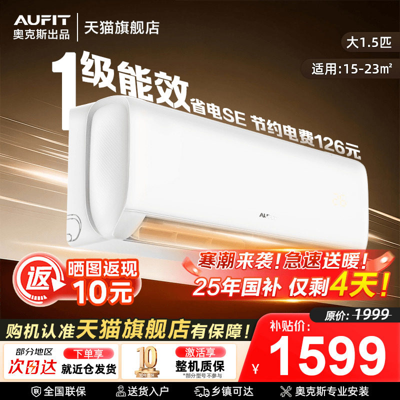 AUFIT空调奥克斯出品大1.5匹超一级能效变频挂机1P卧室家用旗舰店