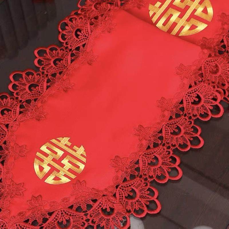 新中式喜字结婚桌旗婚礼喜庆装饰红色蕾丝布艺餐桌茶几电视柜桌布
