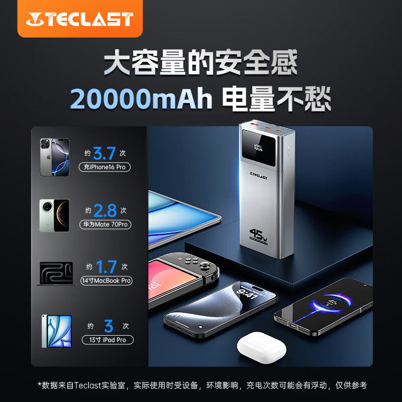 【3c认证】台电2025新款45W超级快充20000毫安充电宝超大容量适用华为小米15苹果17ProMax手机平板电脑笔记本
