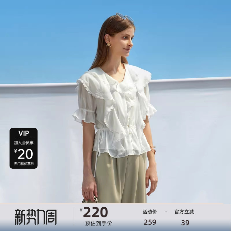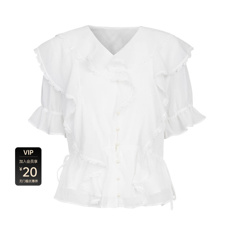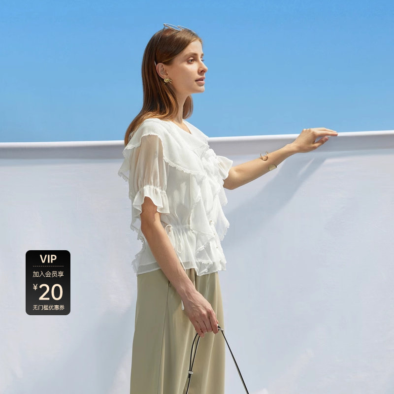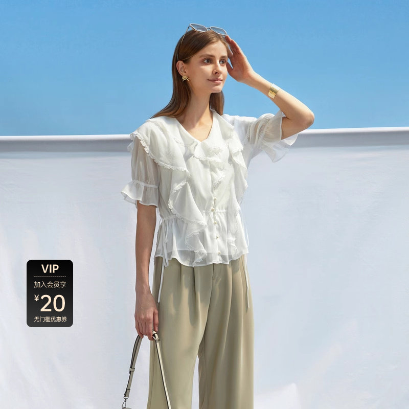 sdeer圣迪奥女装V领荷叶边收腰雪纺衬衫S232Z0441