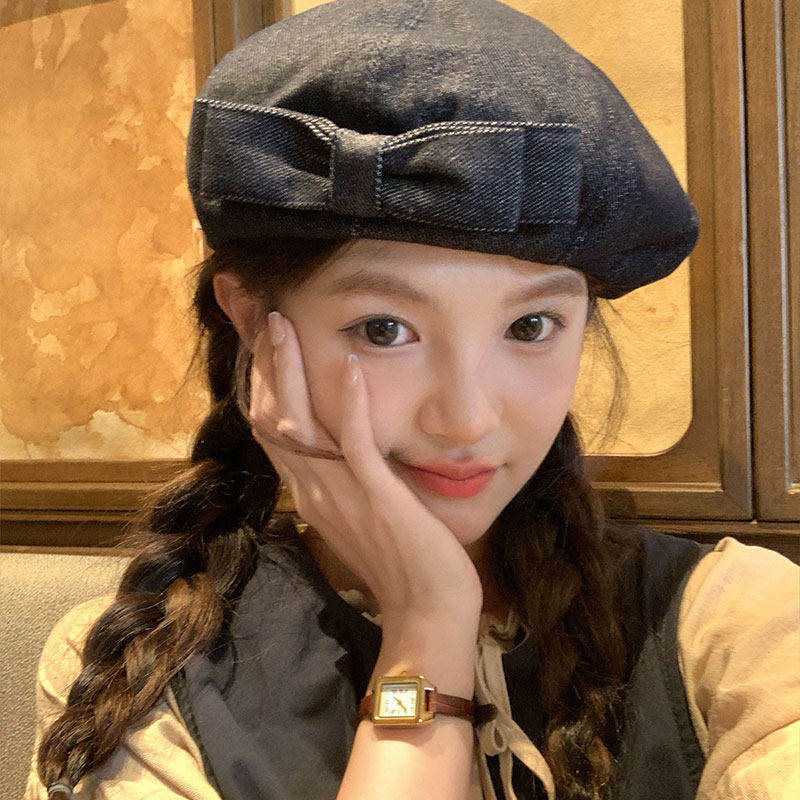 帽子假发一体重工甜美双层蝴蝶结牛仔贝雷帽女显脸小画家帽全头套