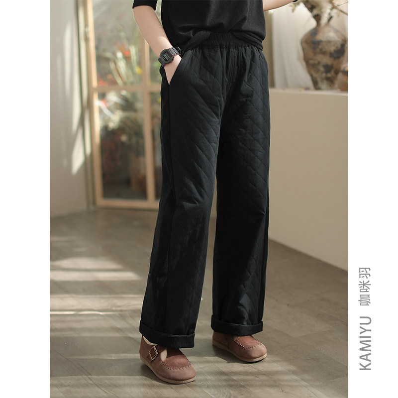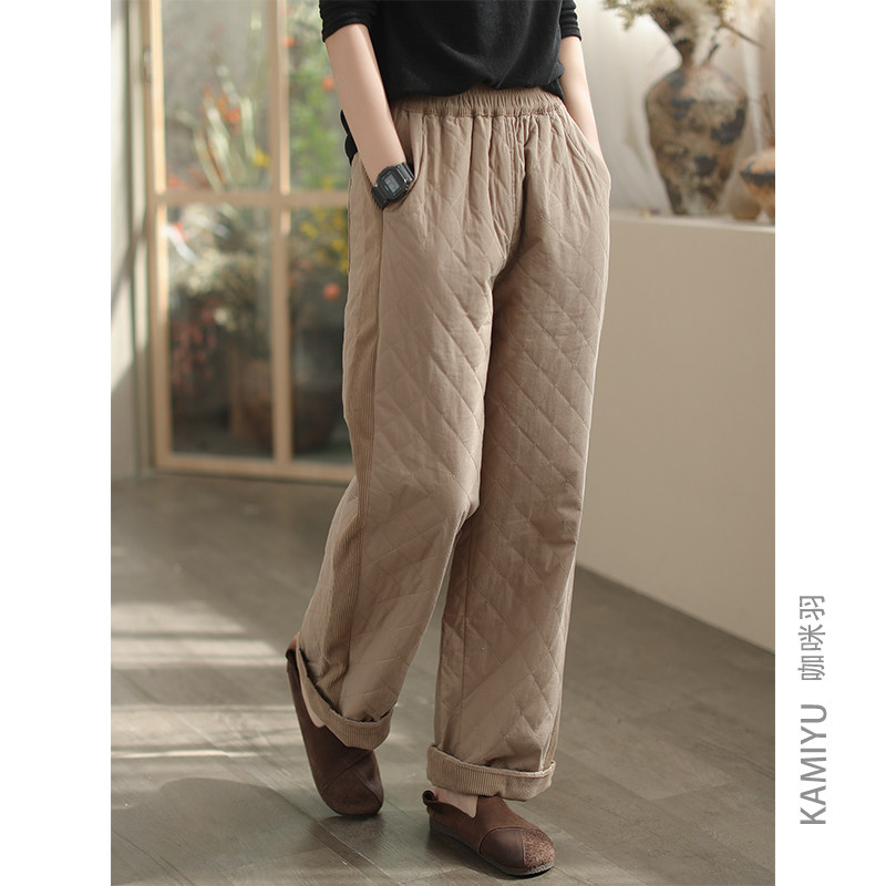 咖咪羽秋冬新款棉裤女加厚高腰全棉复古文艺直筒拼接菱形女装裤子