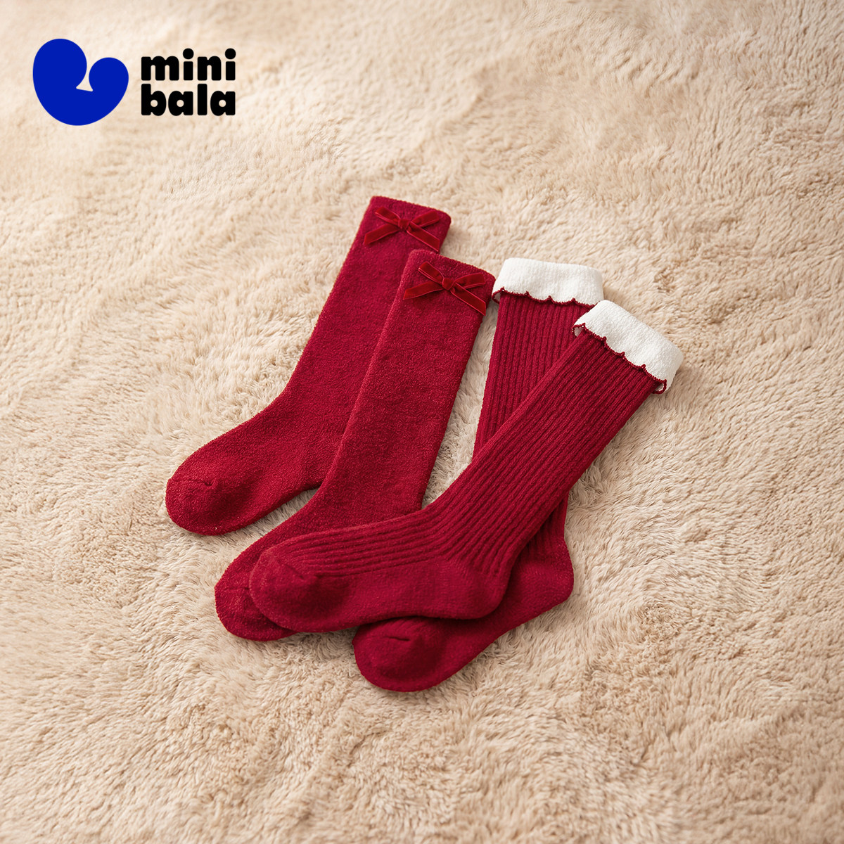 迷你巴拉巴拉婴儿宝宝袜子新生儿柔软保暖毛绒新年红色加厚长筒袜