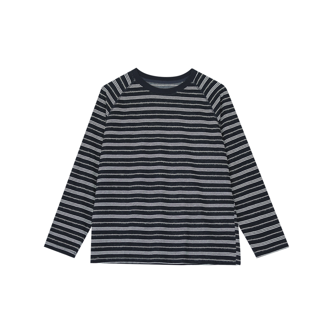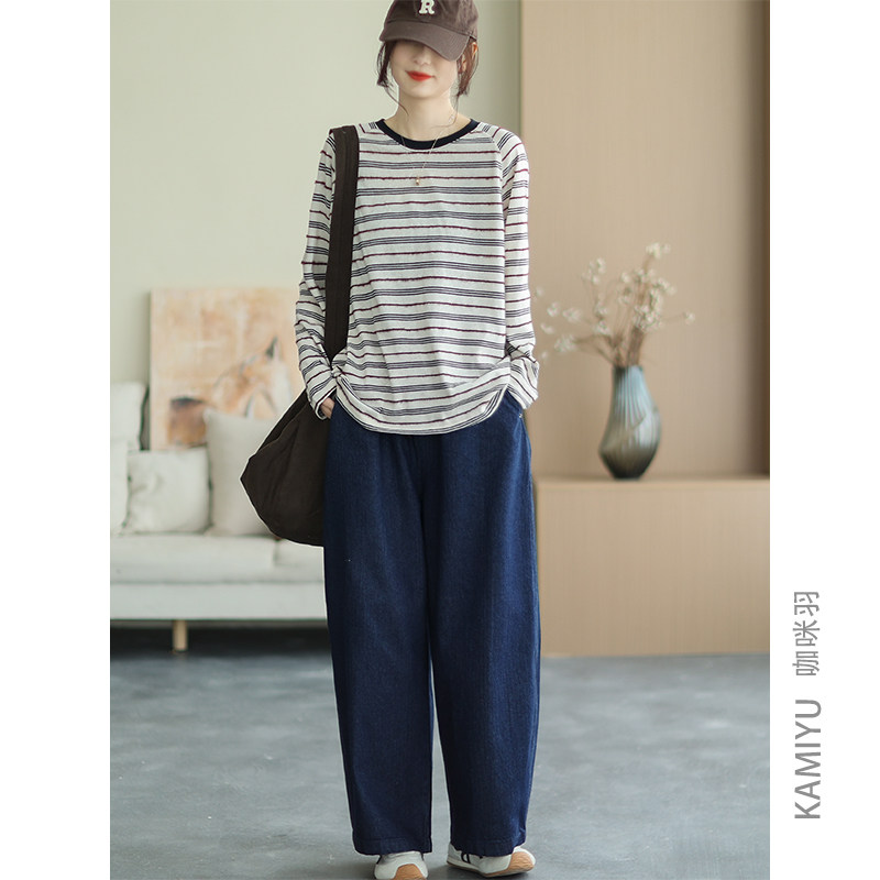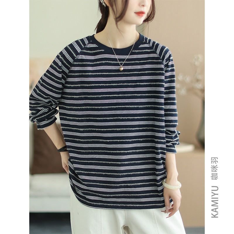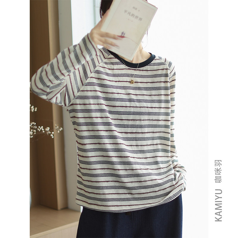 咖咪羽秋款复古条纹棉质通勤时尚拼色圆领显瘦长袖T恤上衣女