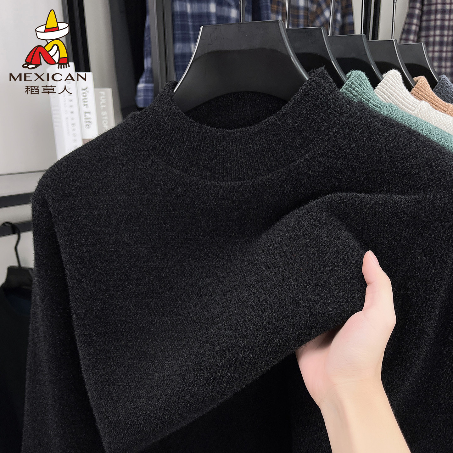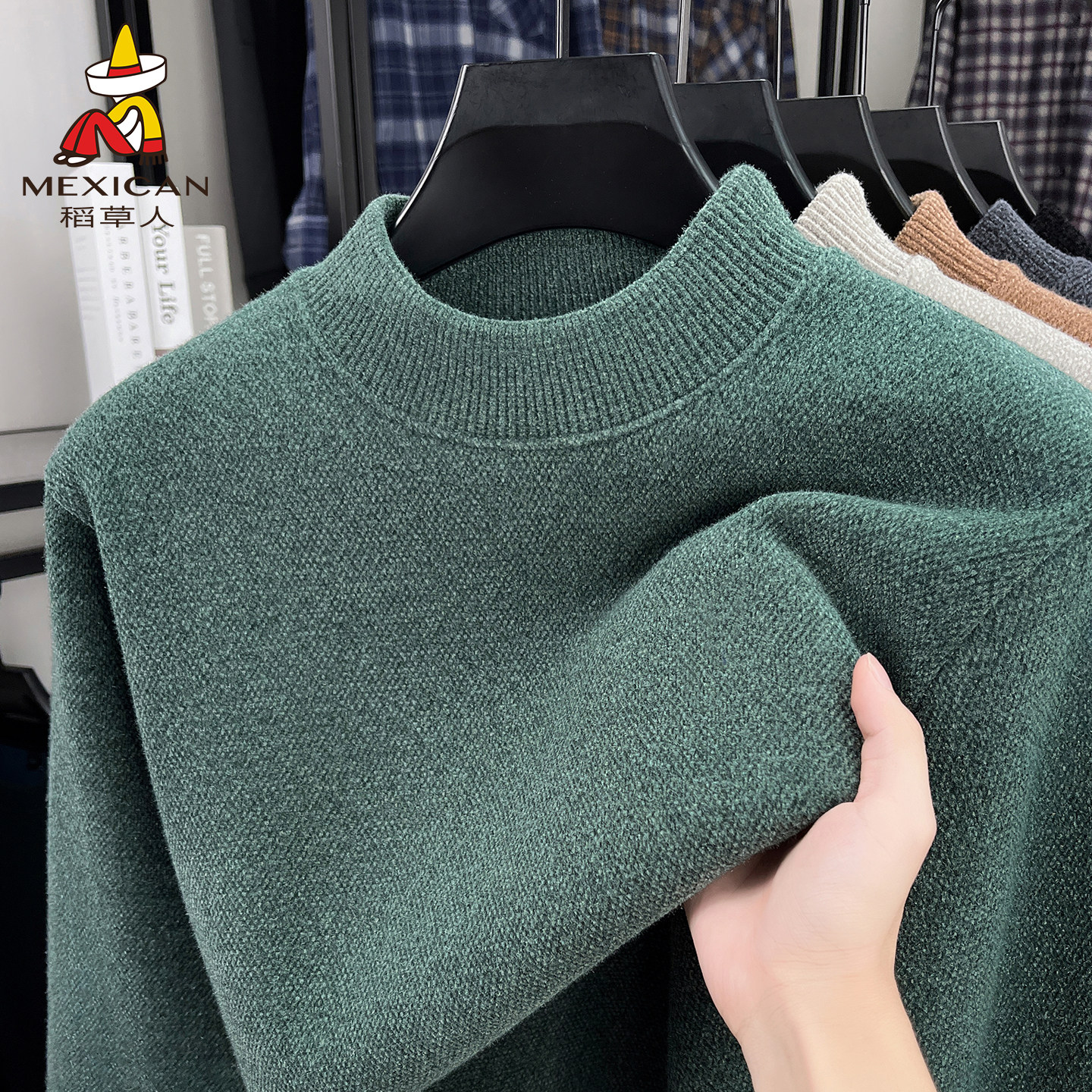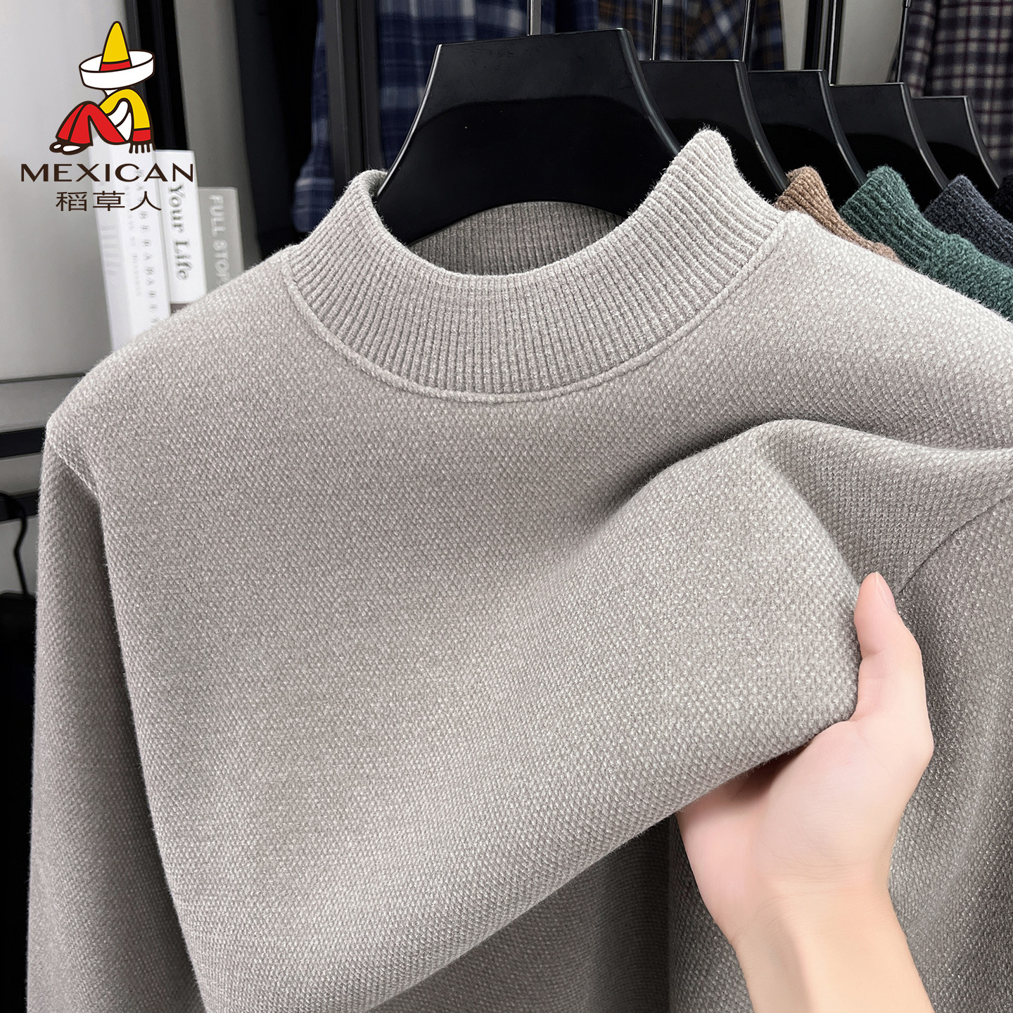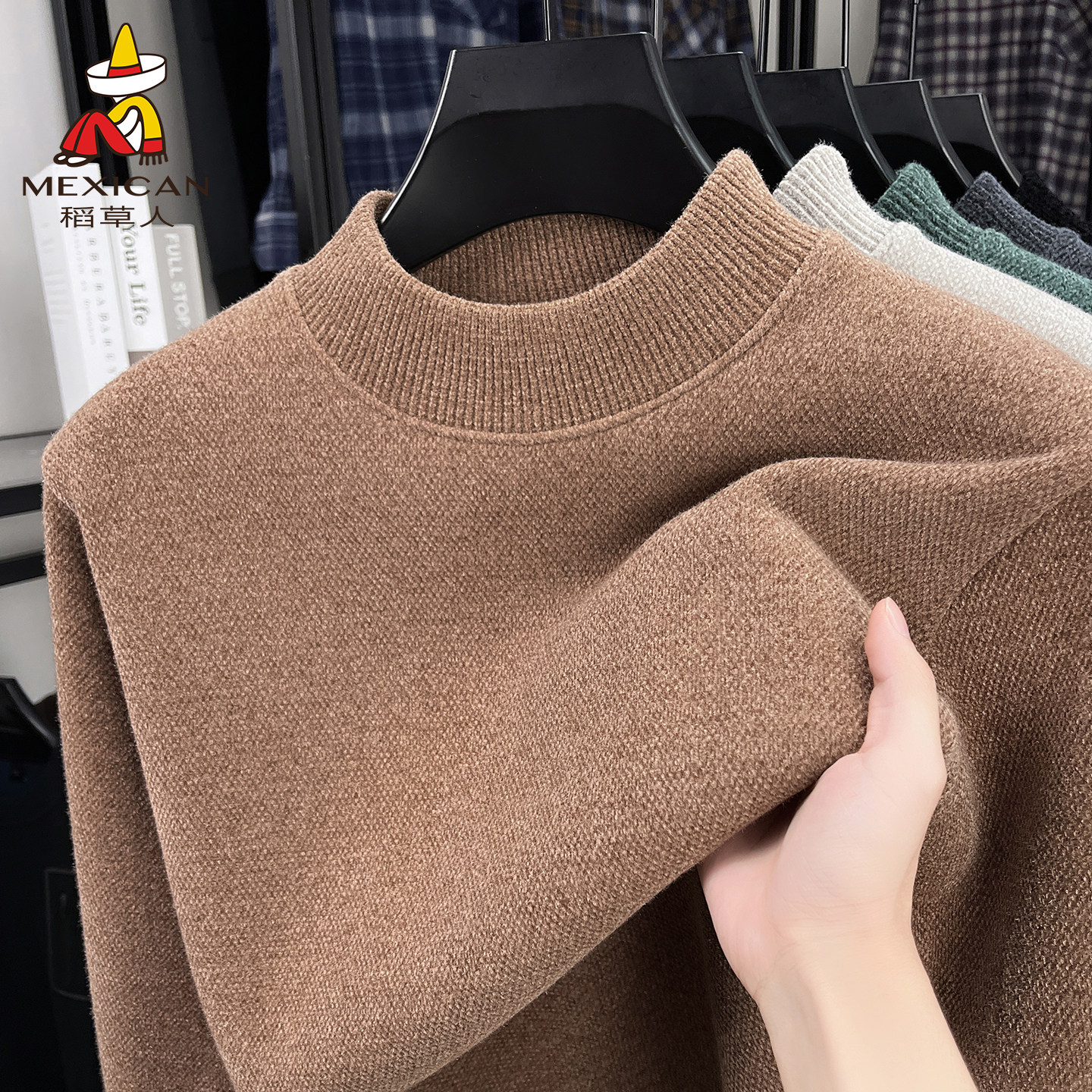 稻草人加绒加厚毛衣男冬季中年半高领纯色保暖一体绒打底针织衫J