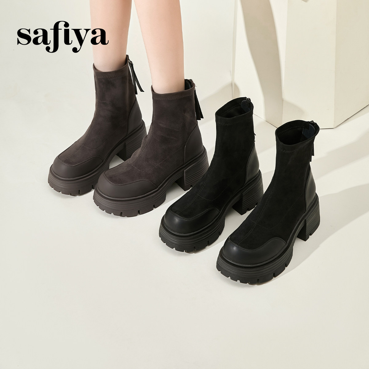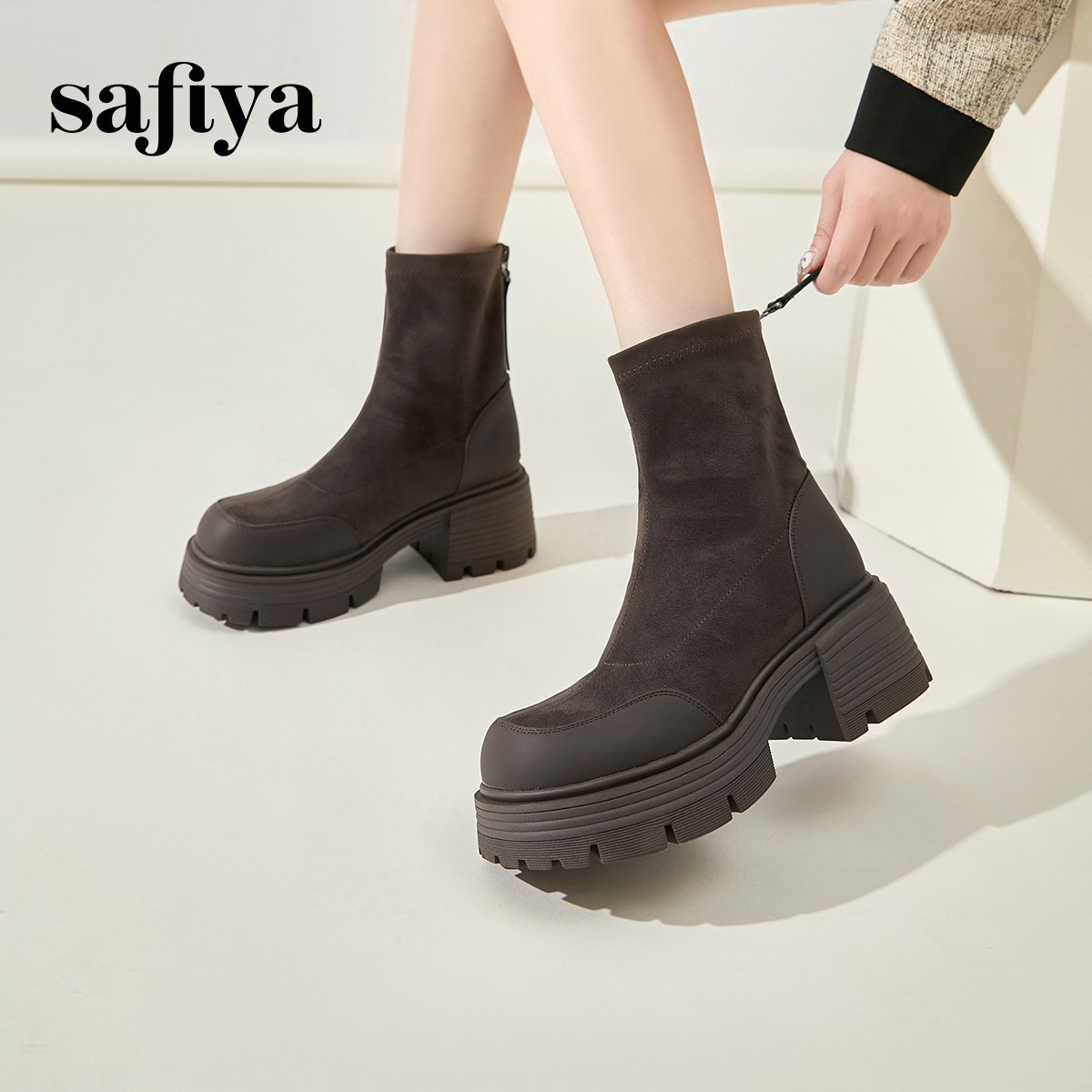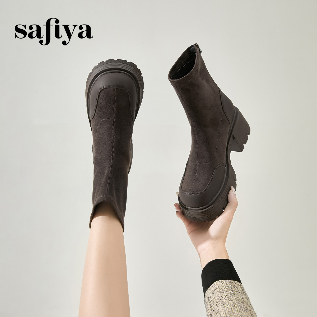 Safiya/索菲娅秋冬绒面拼接圆头百搭厚底增高英伦风瘦瘦弹力靴