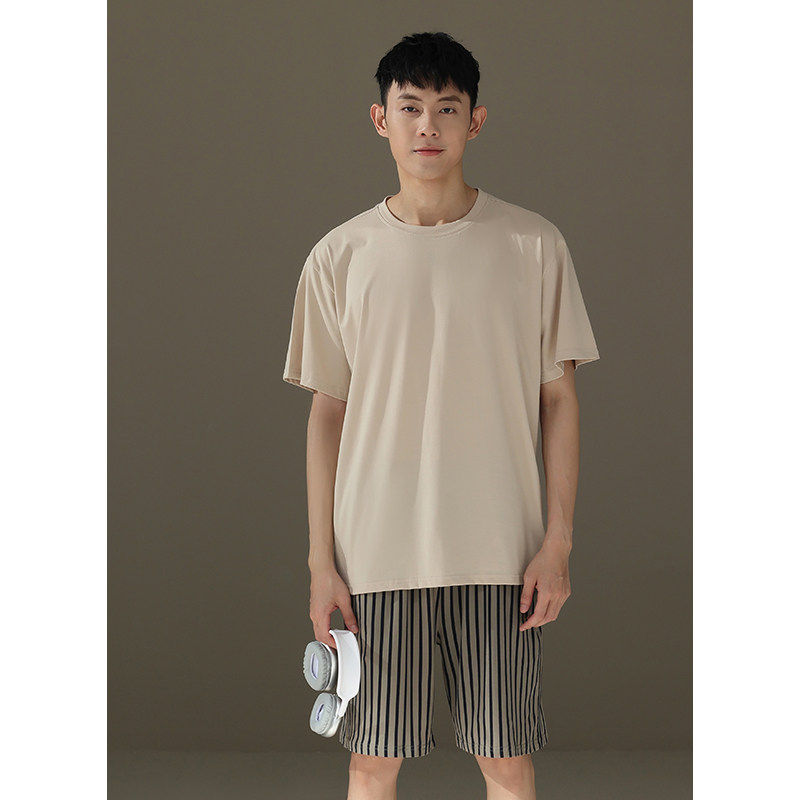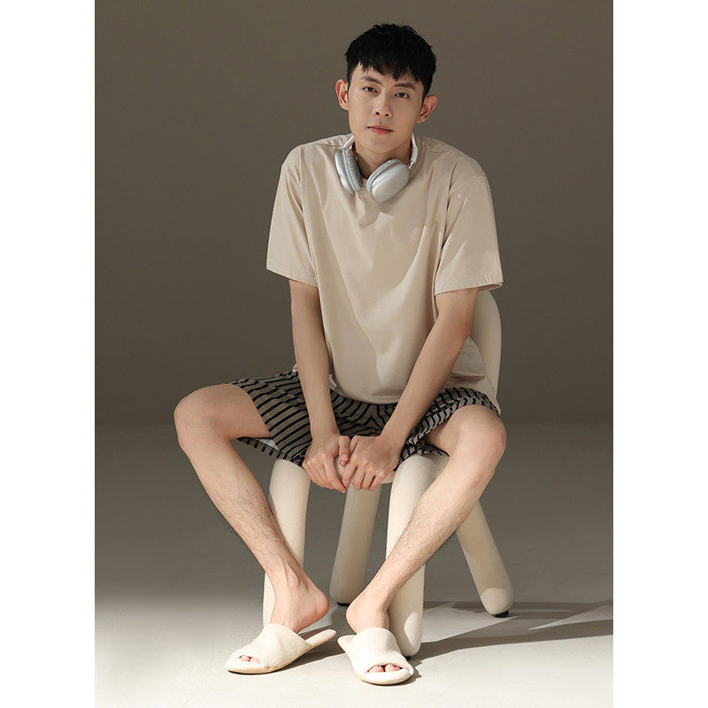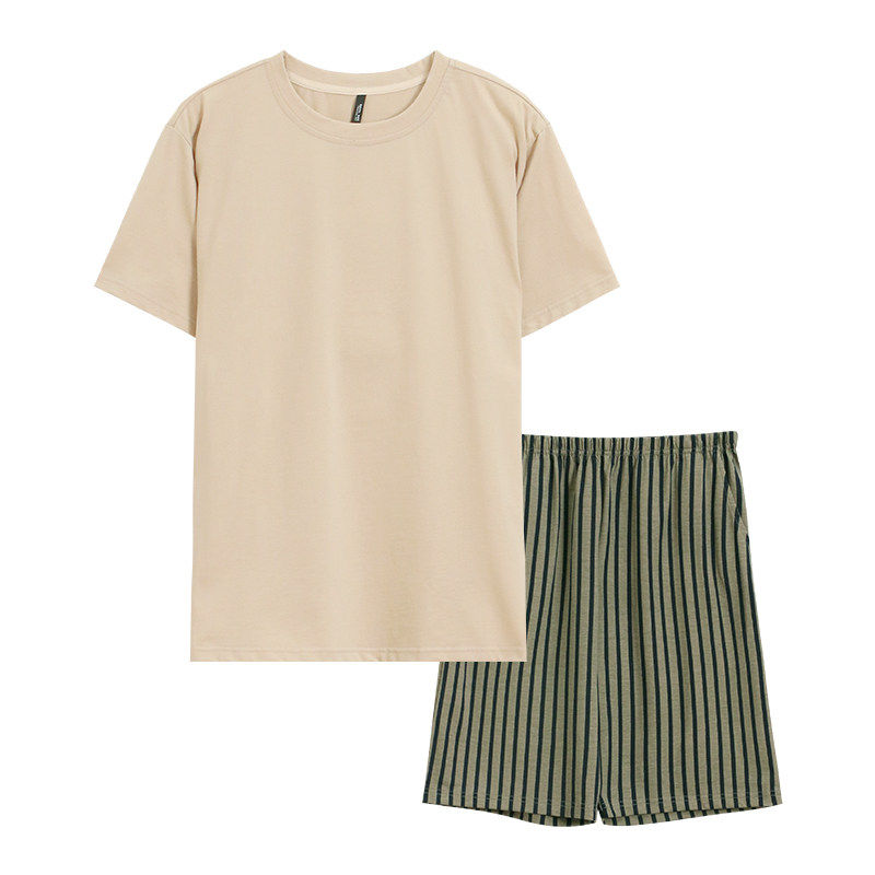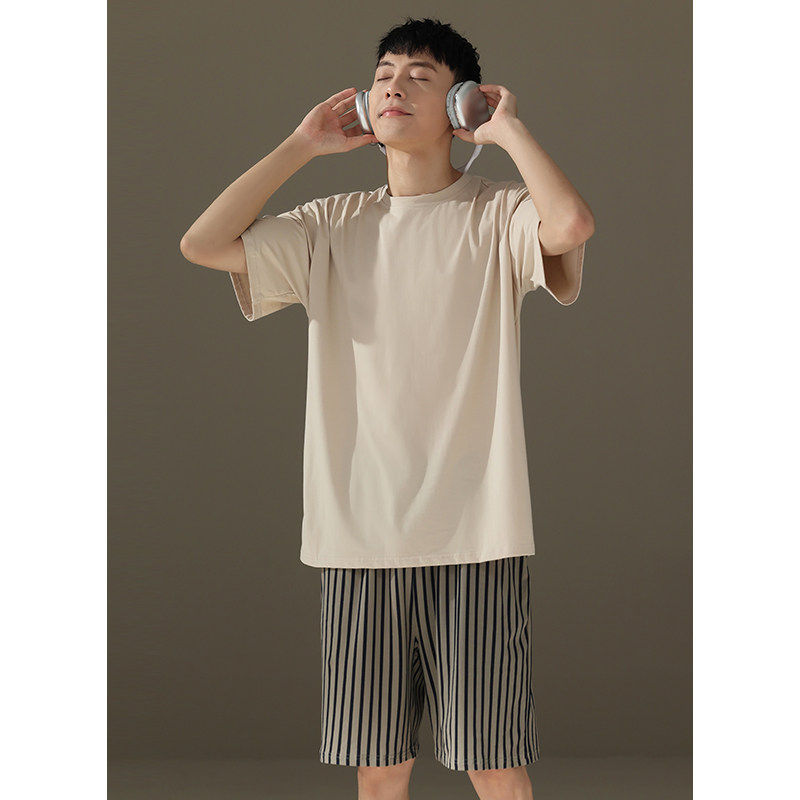 红豆男士睡衣夏季纯棉薄款圆领短袖青少年宽松休闲简约条纹短裤家