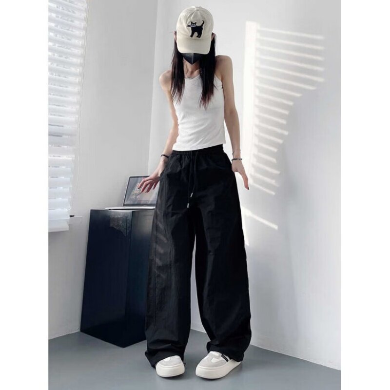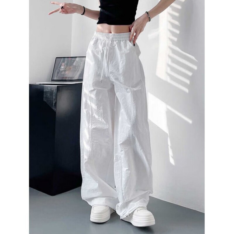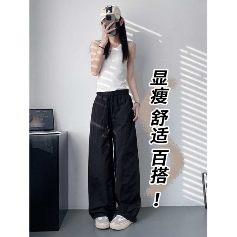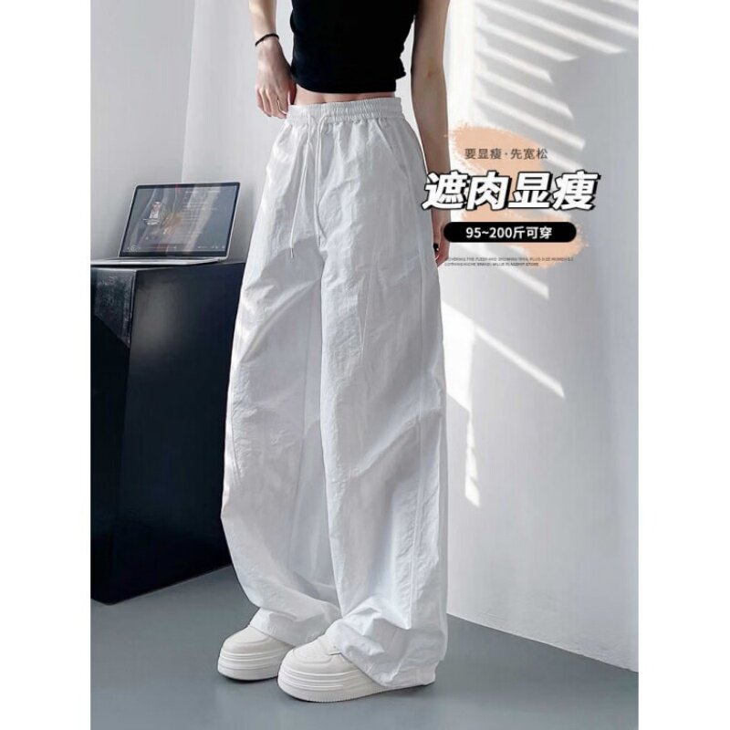 白色不透速干裤女夏季轻薄显瘦遮肉阔腿裤高腰褶皱运动工装裤大码