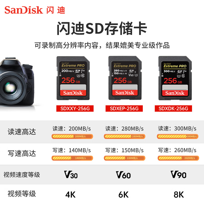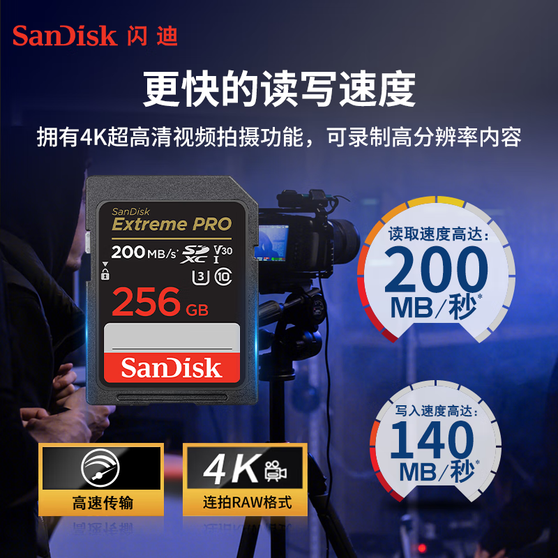 闪迪sd卡256G索尼128g内存卡佳能r50相机V30存储卡64g高速闪存卡