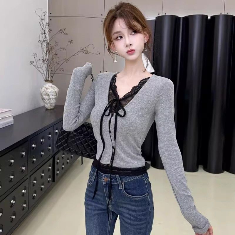 性感假两件蕾丝拼接长袖T恤女秋冬新款巨好看修身显瘦短款上衣潮