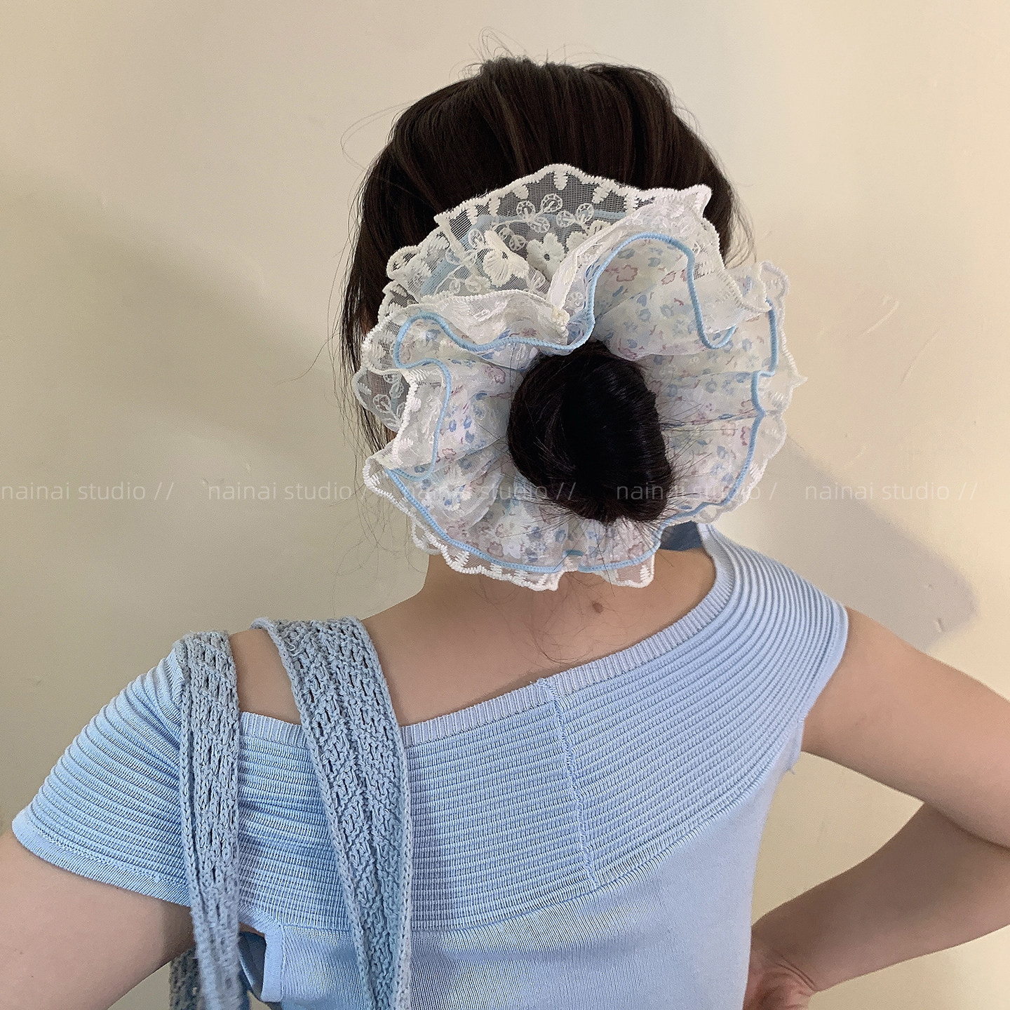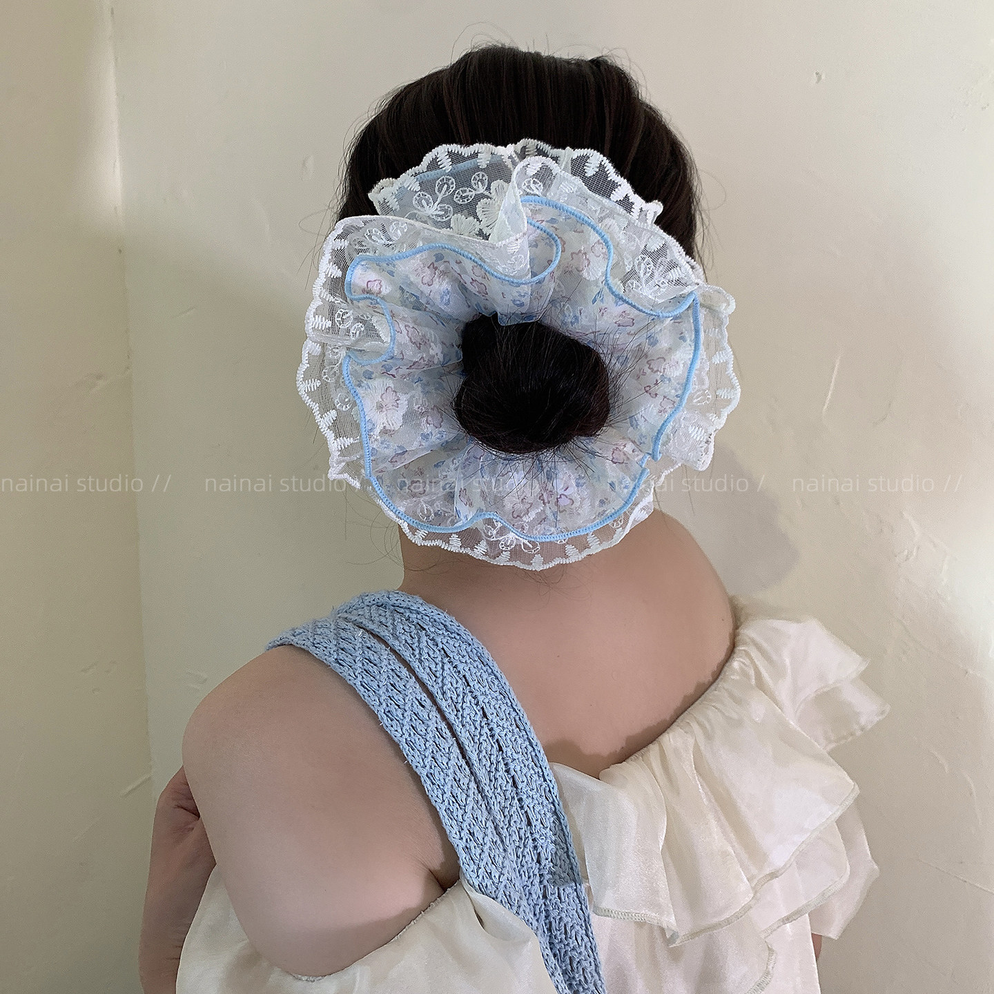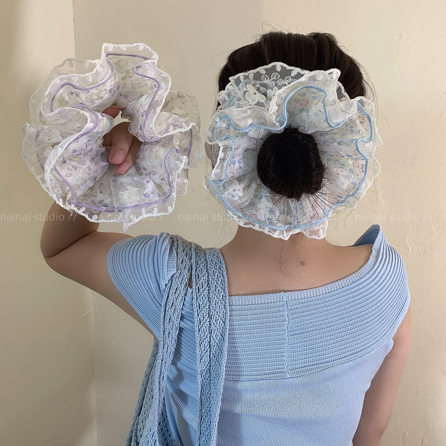 紫色+蓝色大肠发圈~蕾丝花边小碎花超仙4层气质大号丸子头发绳女