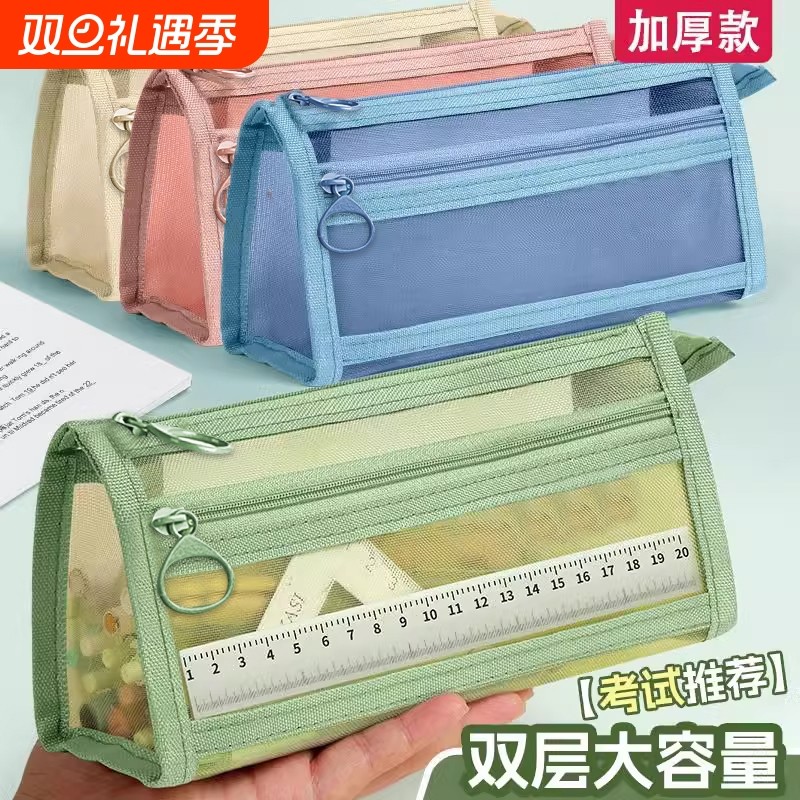 华杰笔袋透明网纱学生考试专用文具袋儿童铅笔袋双层立体大容量文具盒男女孩款2024新款简约便携收纳袋高颜值