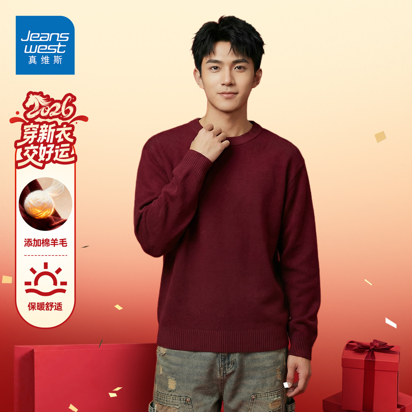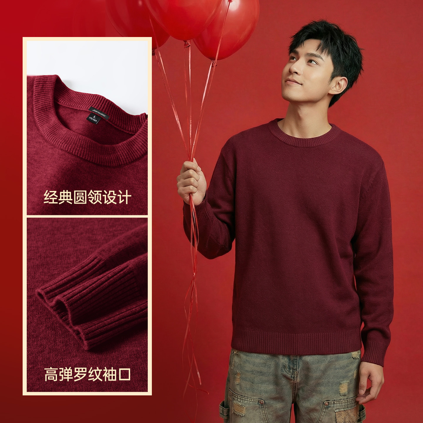 GV真维斯红色毛衣男冬季本命年男士针织衫含羊毛衫情侣内搭上衣C