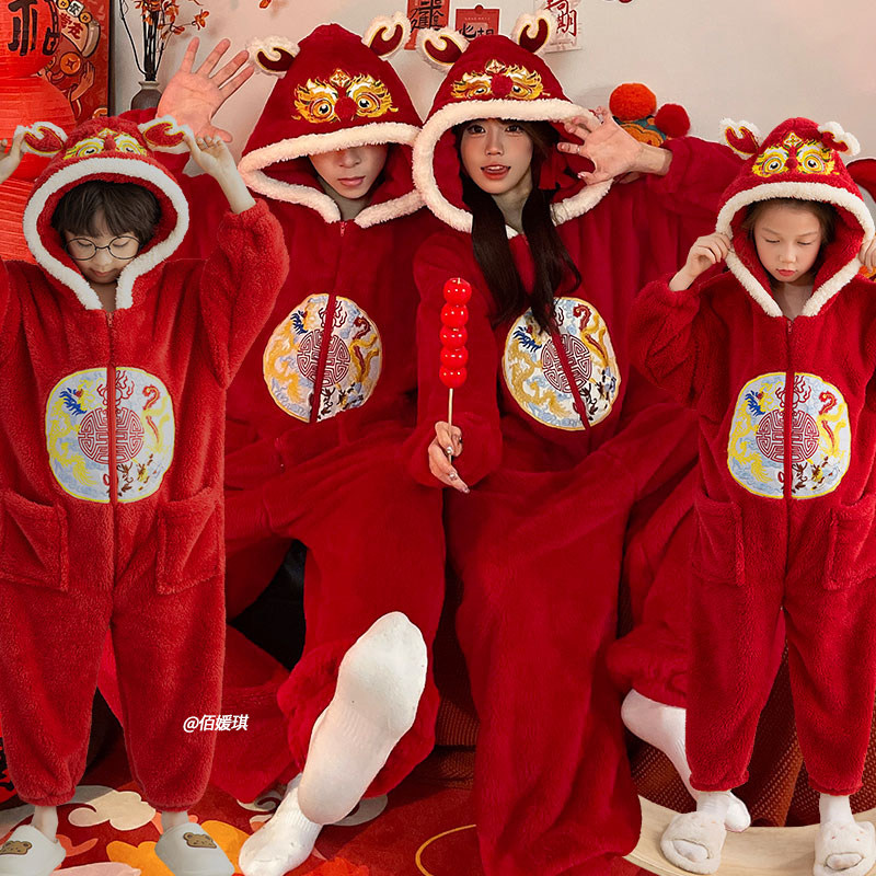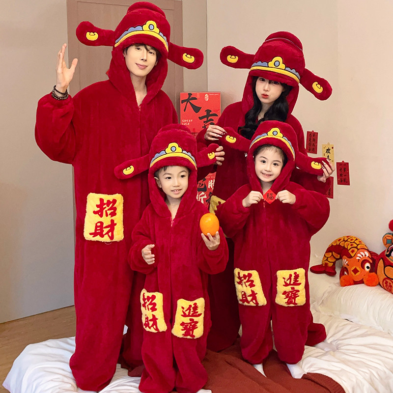 珊瑚绒睡衣女款亲子装2026超火冬装一整套财神爷睡袋儿童家居服男