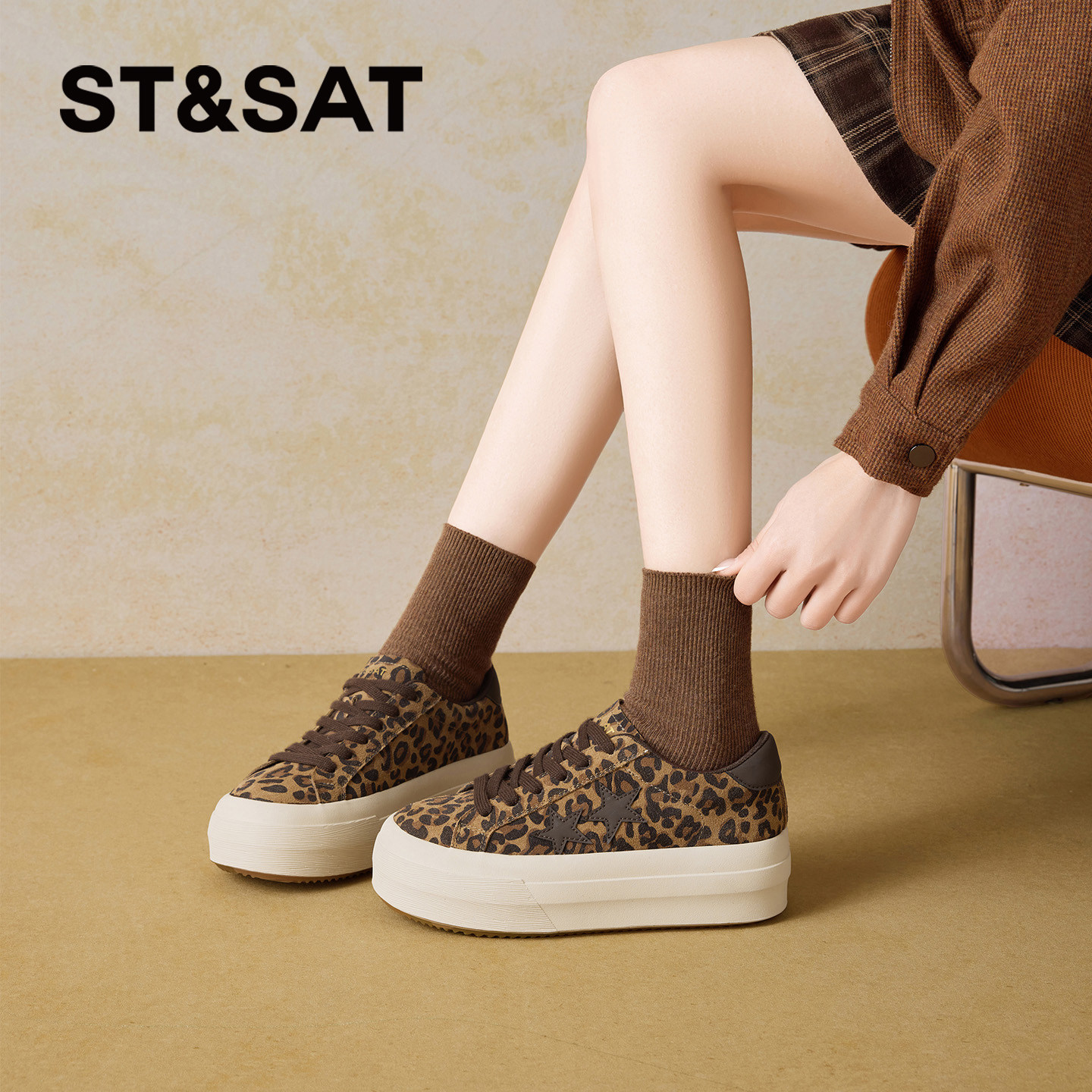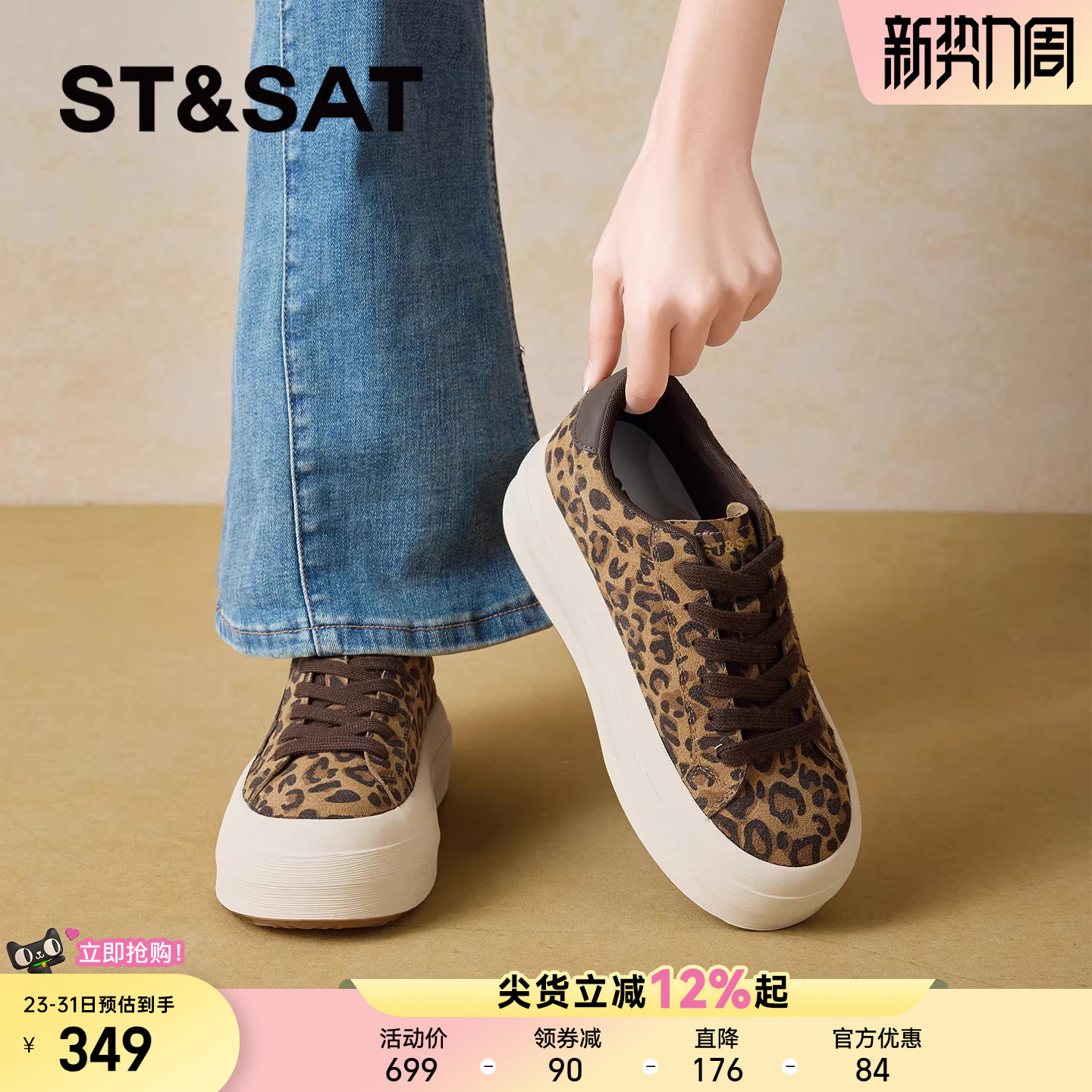 星期六厚底豹纹板鞋女2026春季新款透气星星鞋百搭透气时尚休闲鞋