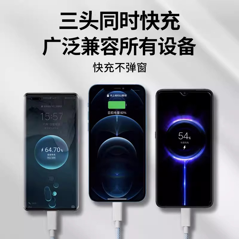 超级快充三合一数据线通用充电线适用苹果荣耀华为OPPO小米VIVO手机通用车载一拖三数据线透明芯片type-c带灯