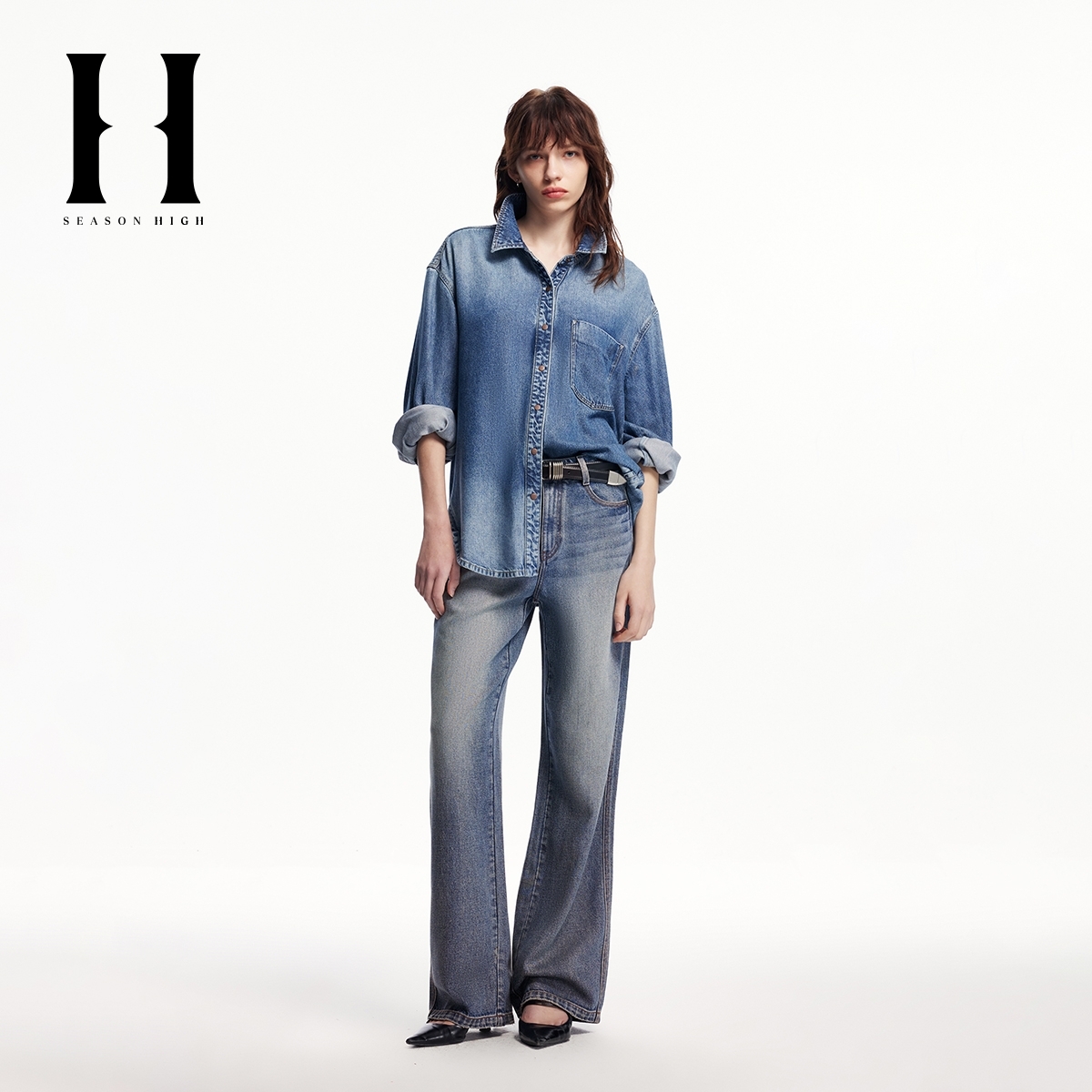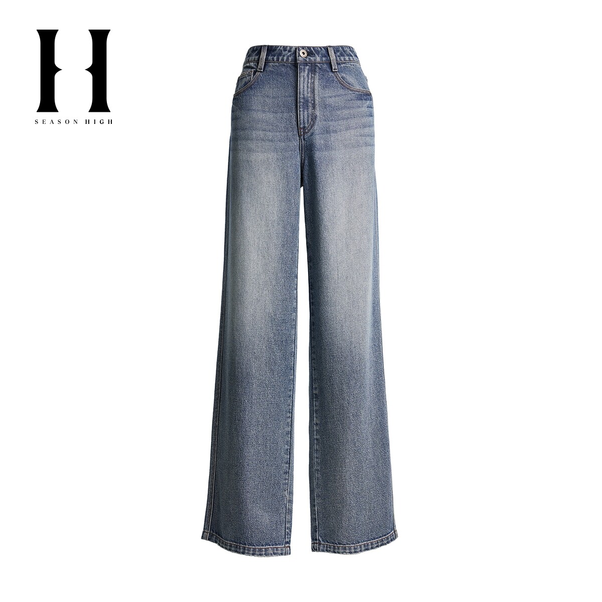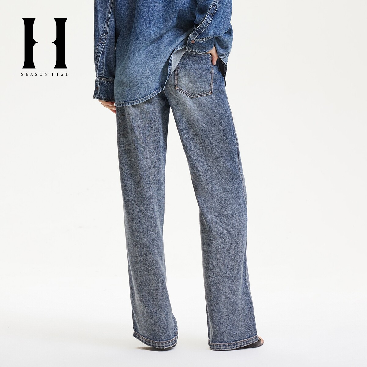 SEASON HIGH秋季直筒版型时尚潮流猫须水洗牛仔裤女装