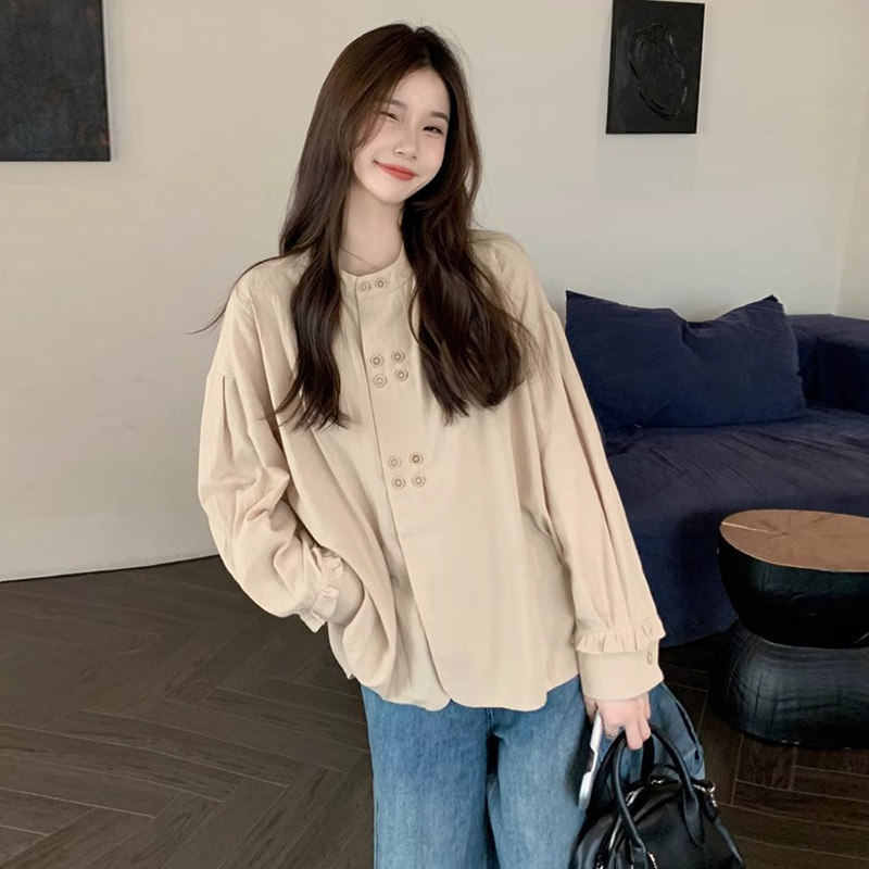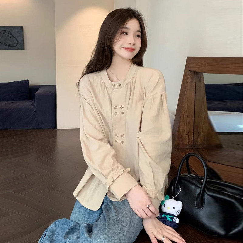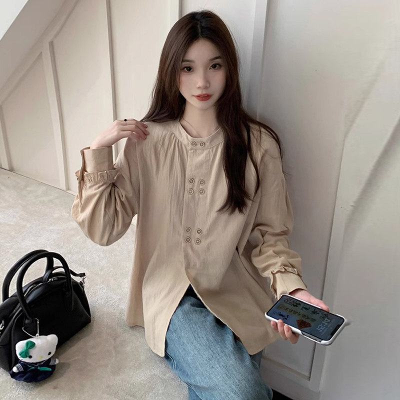 婧麒孕妇装上衣春新款复古文艺女双排扣设计感小众宽松长袖衬衫女