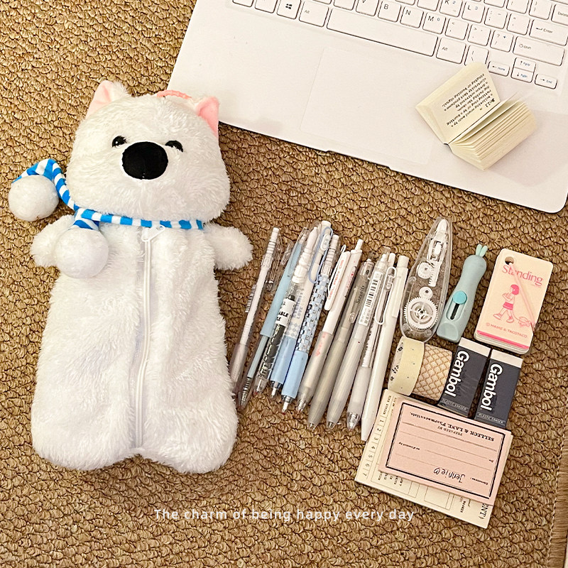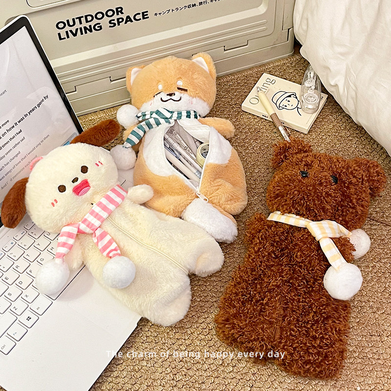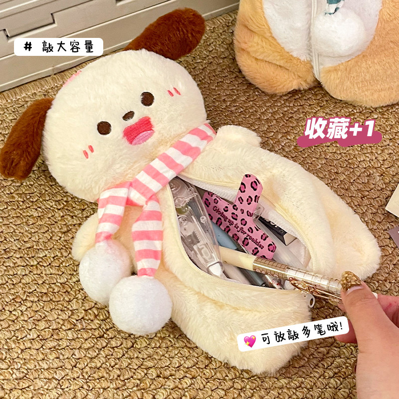 毛绒公仔可爱小狗笔袋便携手提大容量文具收纳袋卡通学生铅笔袋