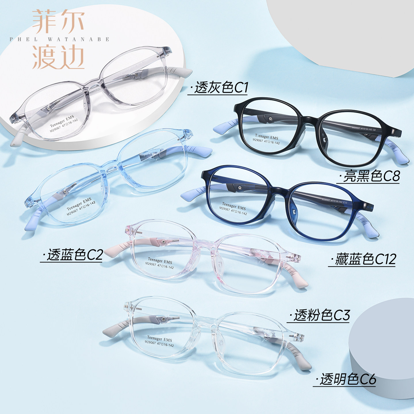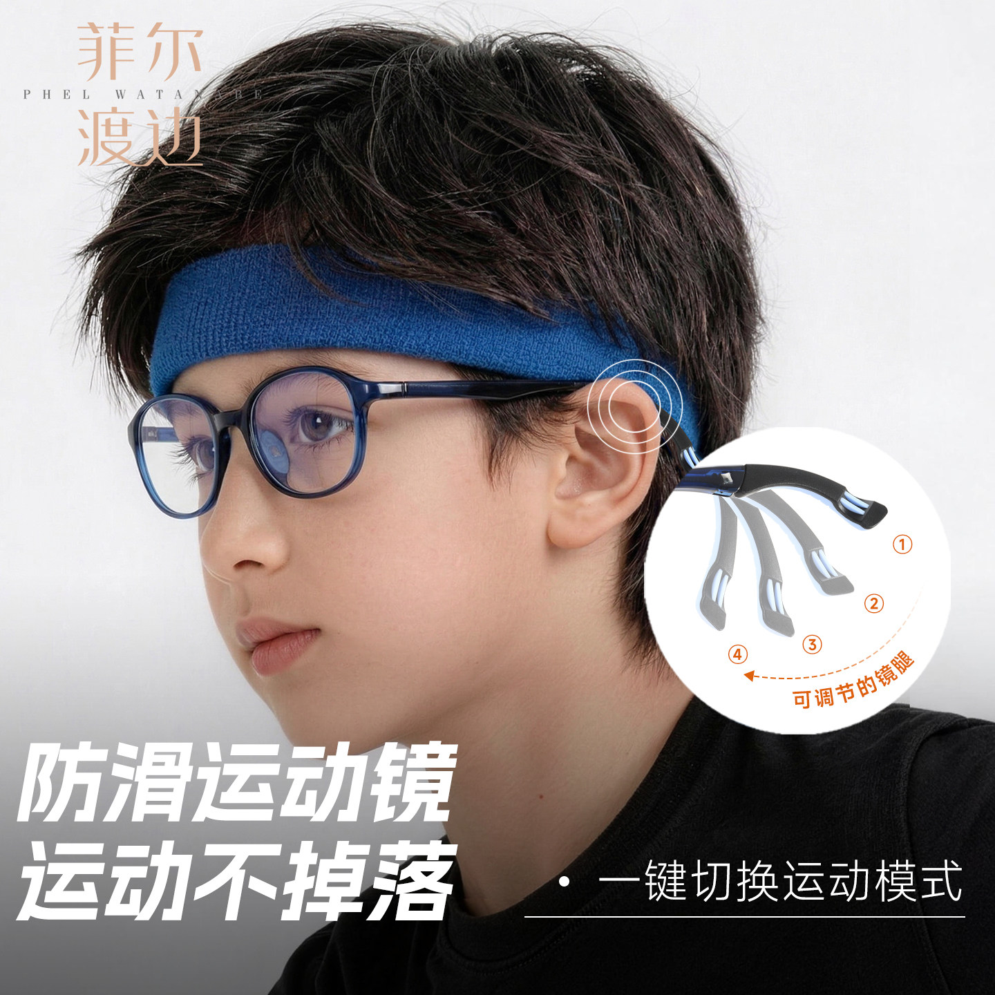 菲尔渡边青少年运动眼镜硅胶可调节镜腿打篮球近视眼镜框男29067