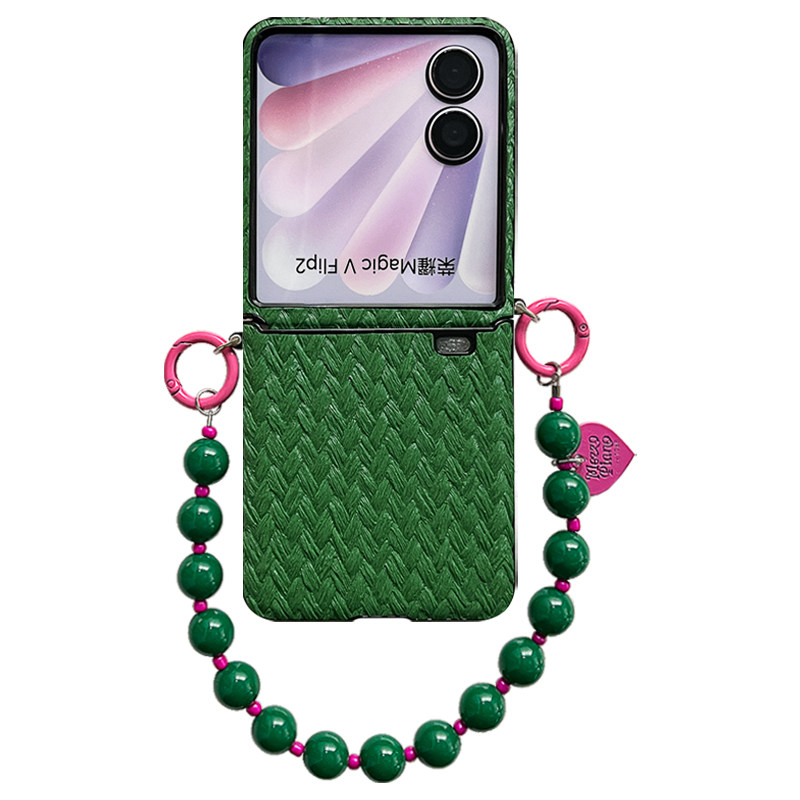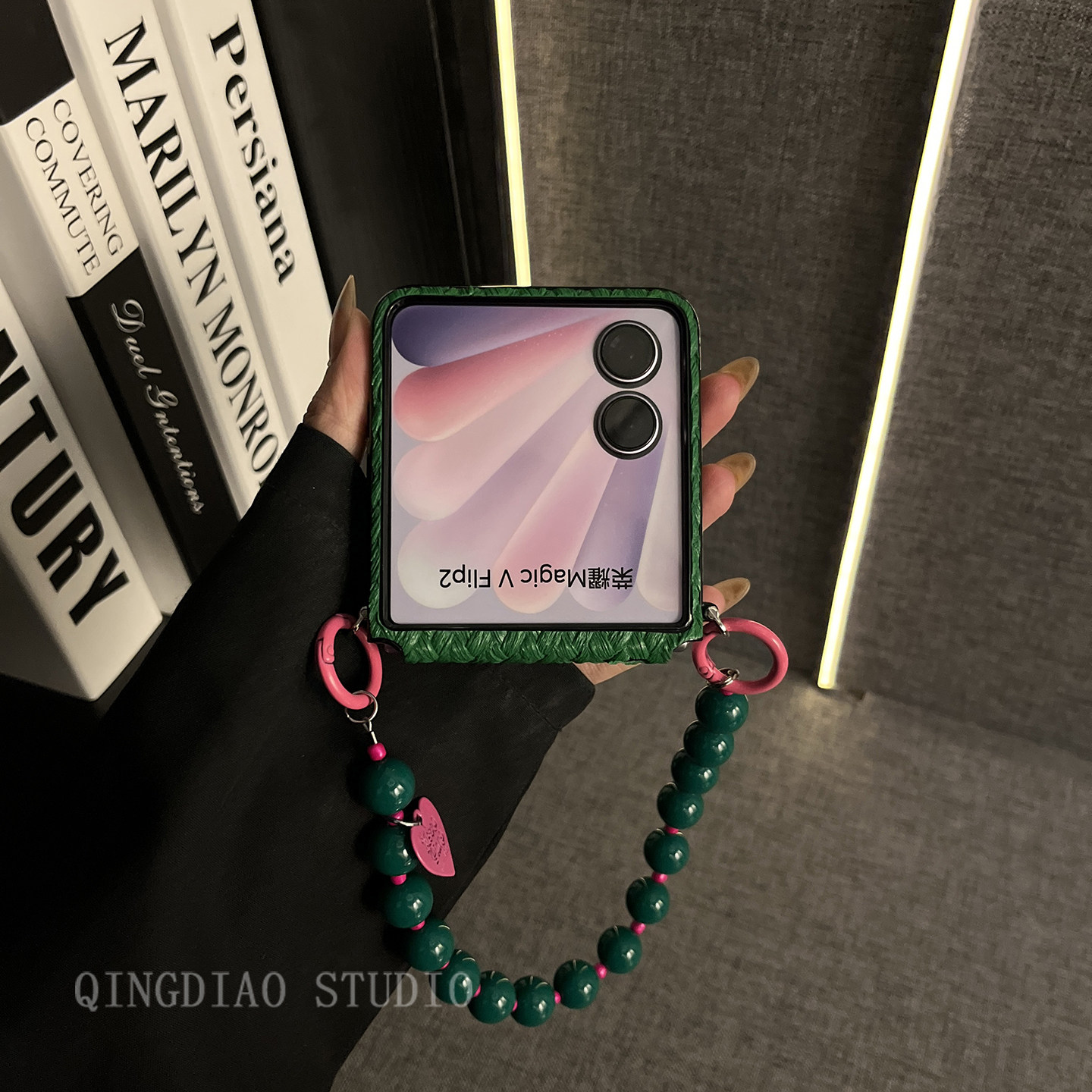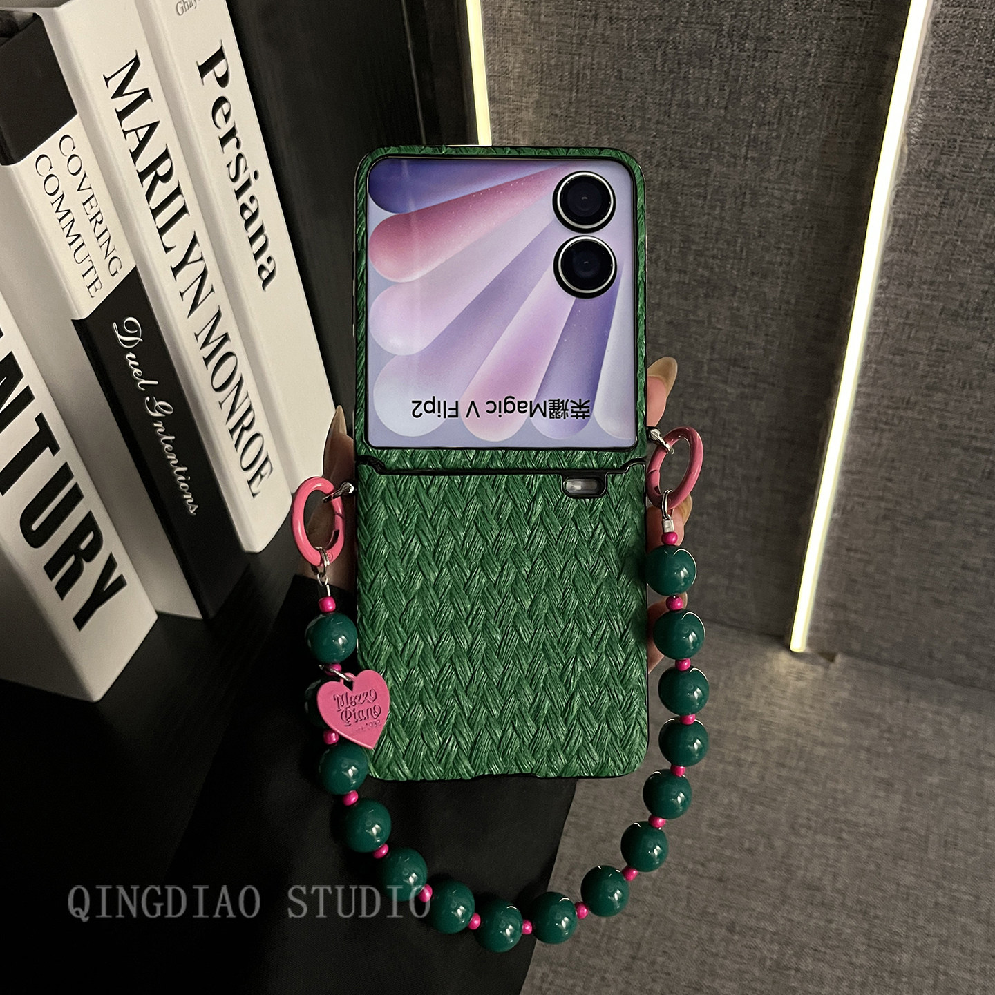 轻调 日韩墨绿草席纹玫红环串珠手链适用于荣耀MagicVFlip2手机壳新款Magic折叠屏V FLIP防摔肤感翻盖保护套