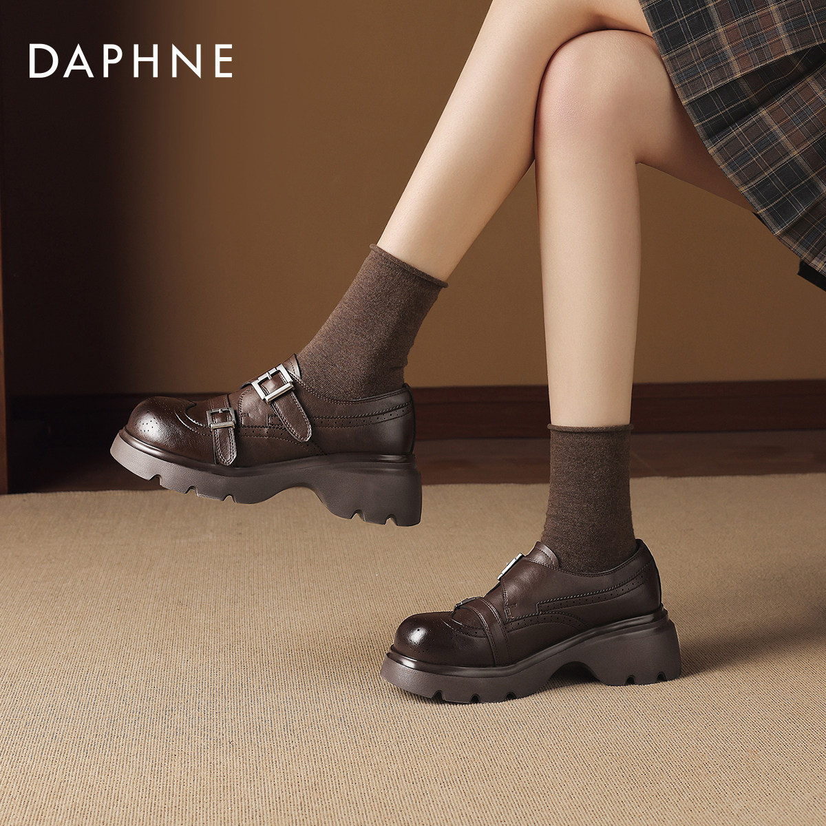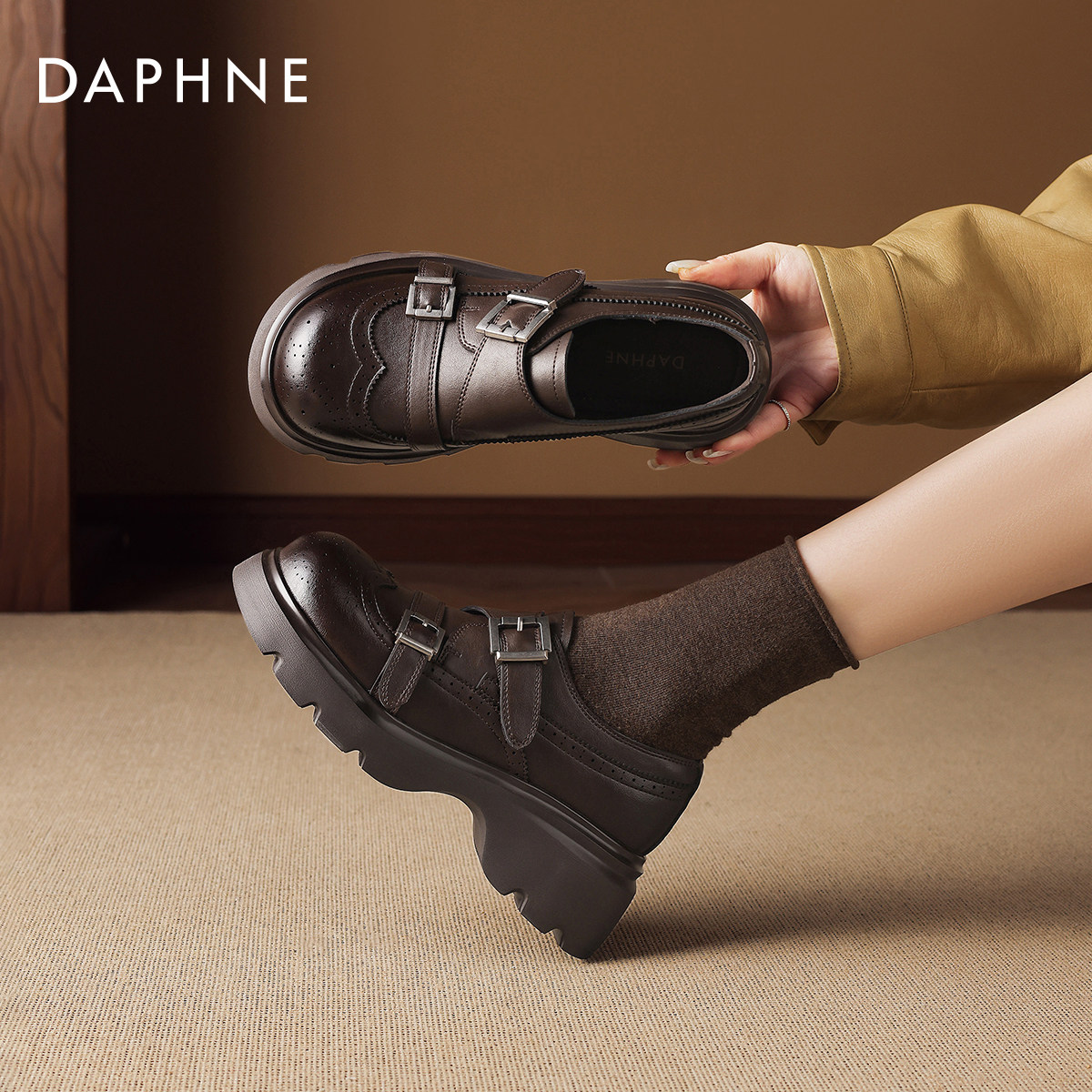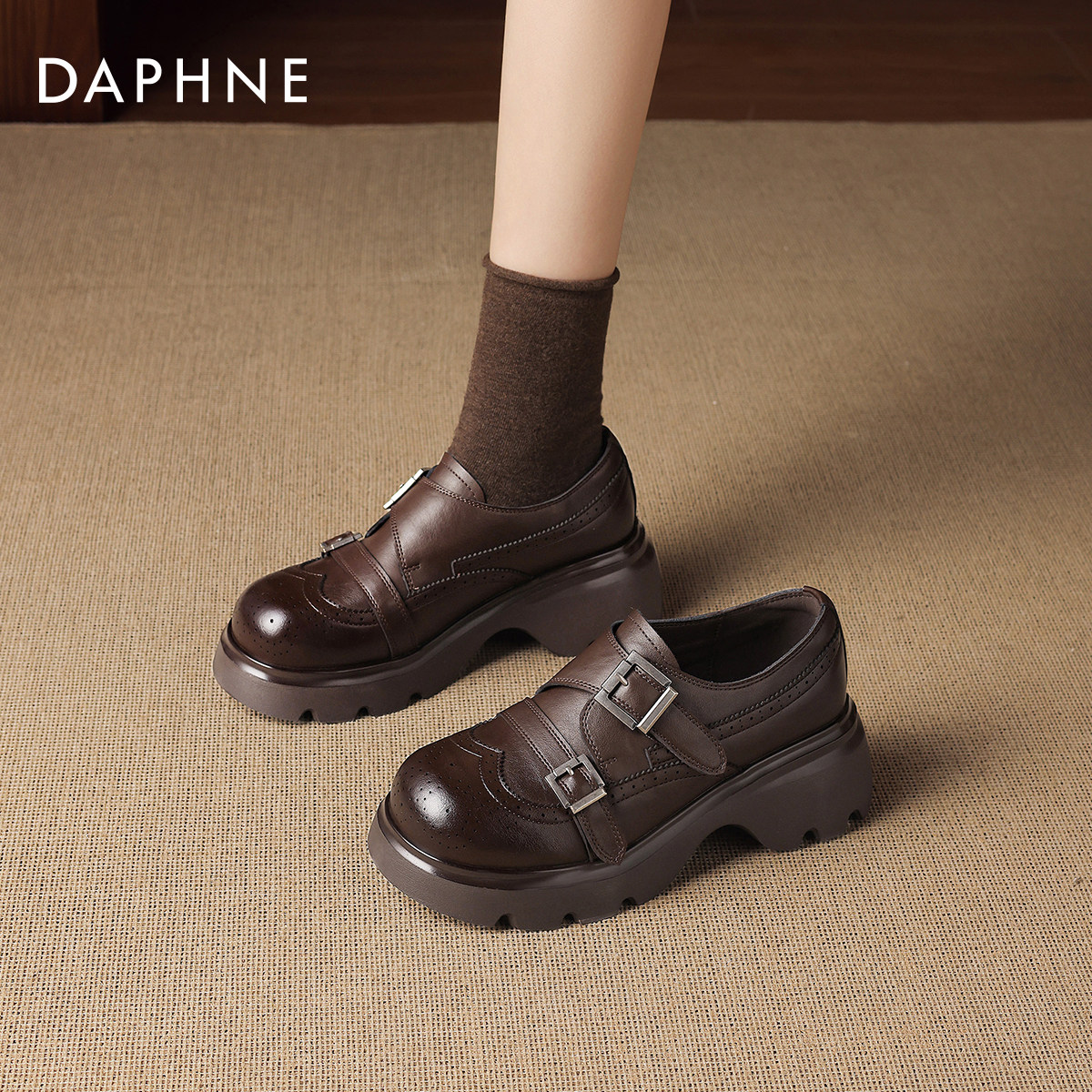 达芙妮厚底乐福鞋女2026新款春英伦风小皮鞋棕色学院风布洛克单鞋