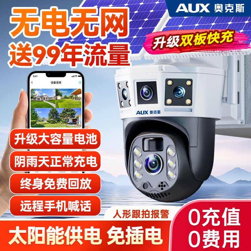 奥克斯太阳能监控器无电无网户外360度无死角室外监控摄影头摄像