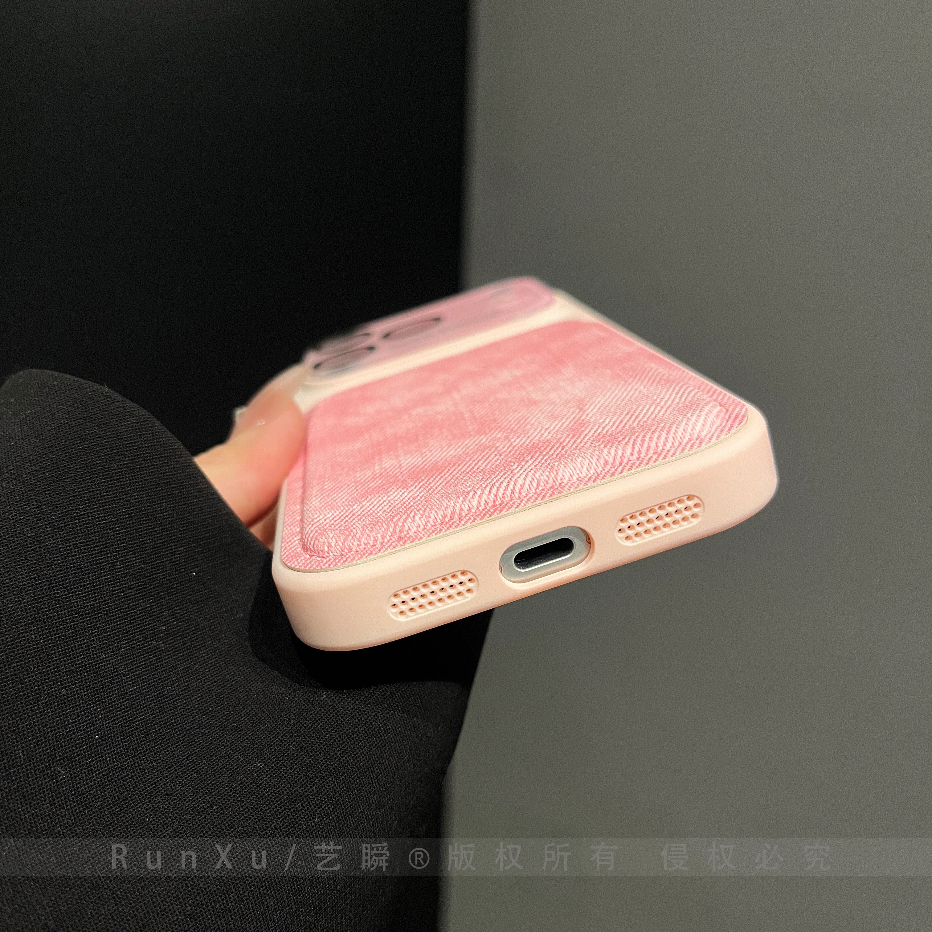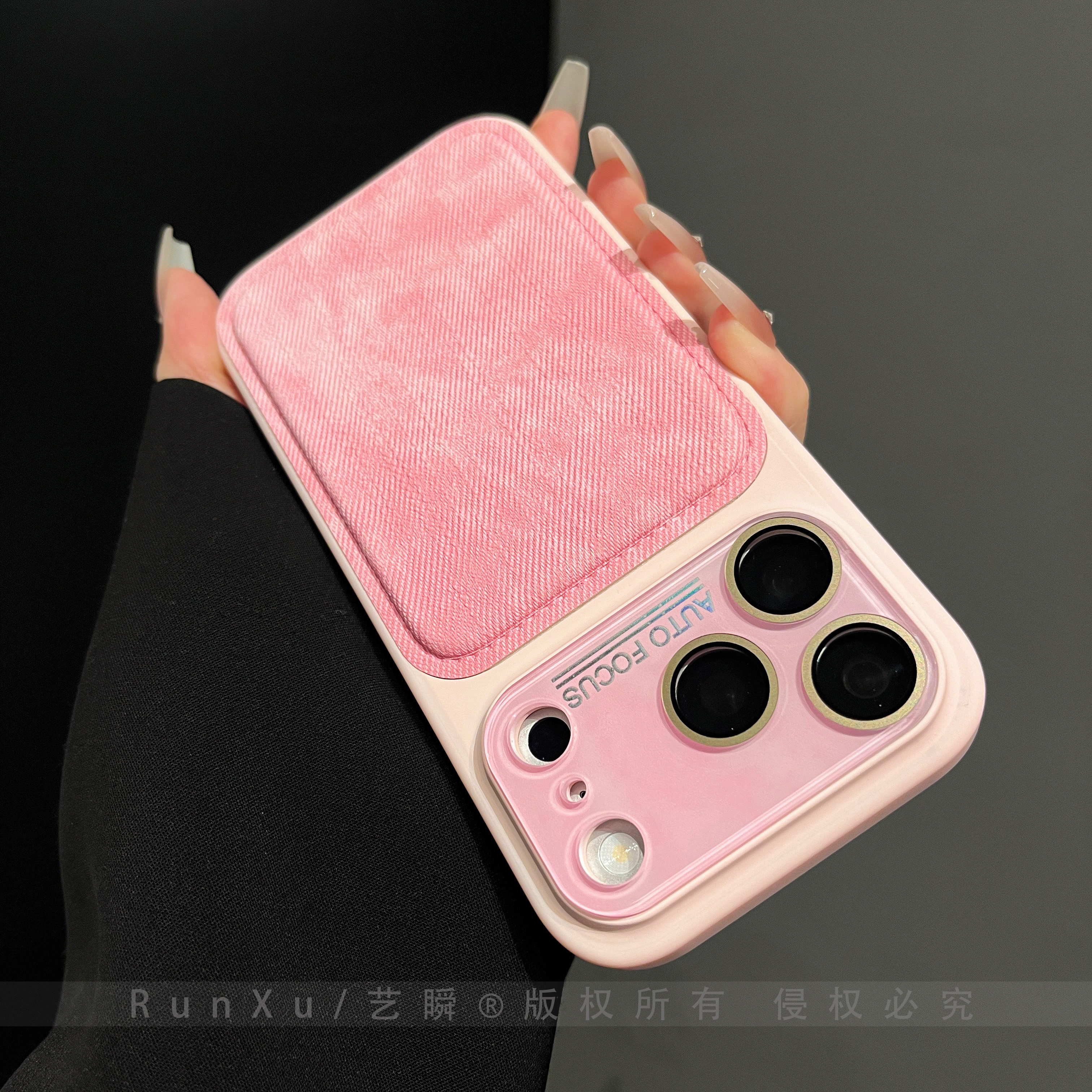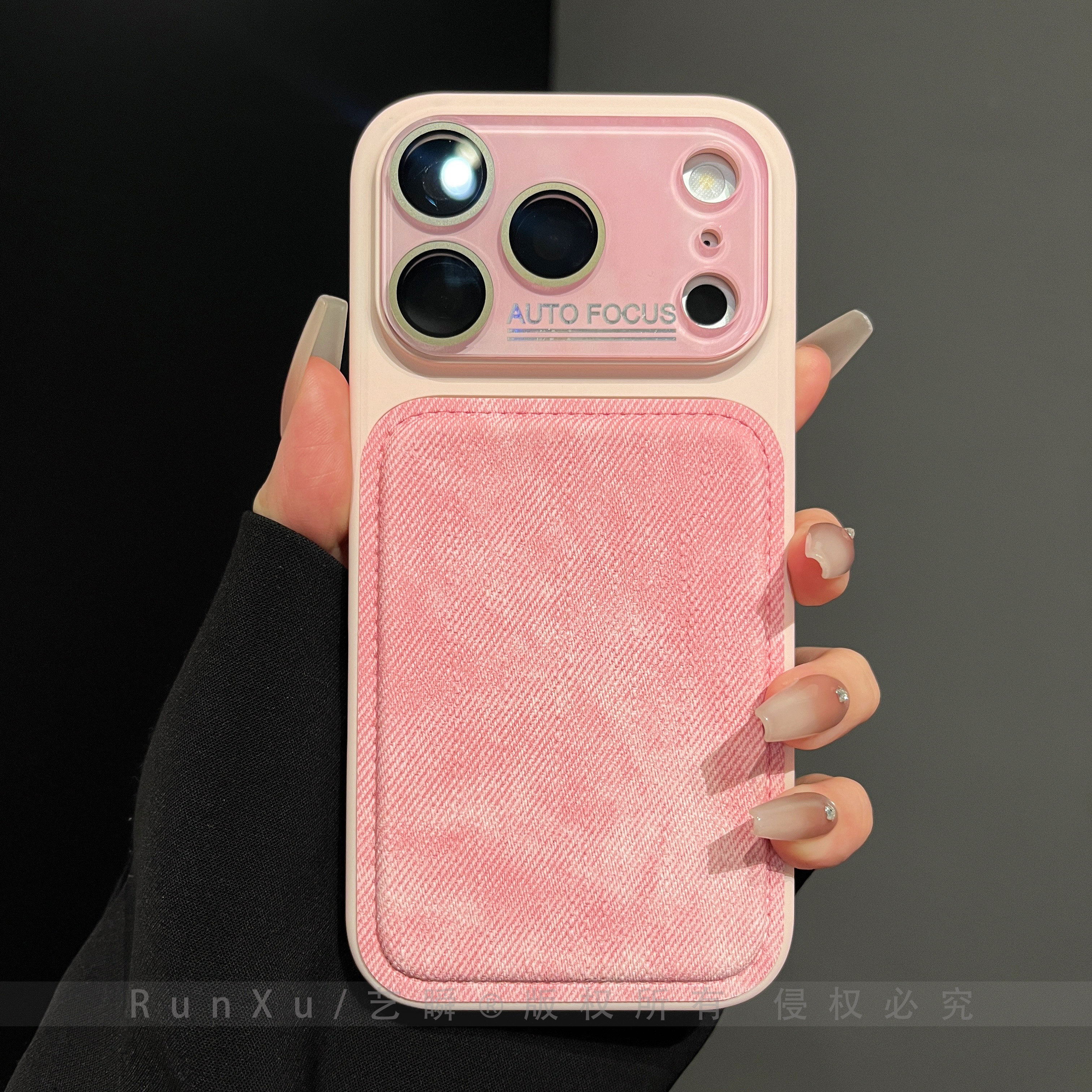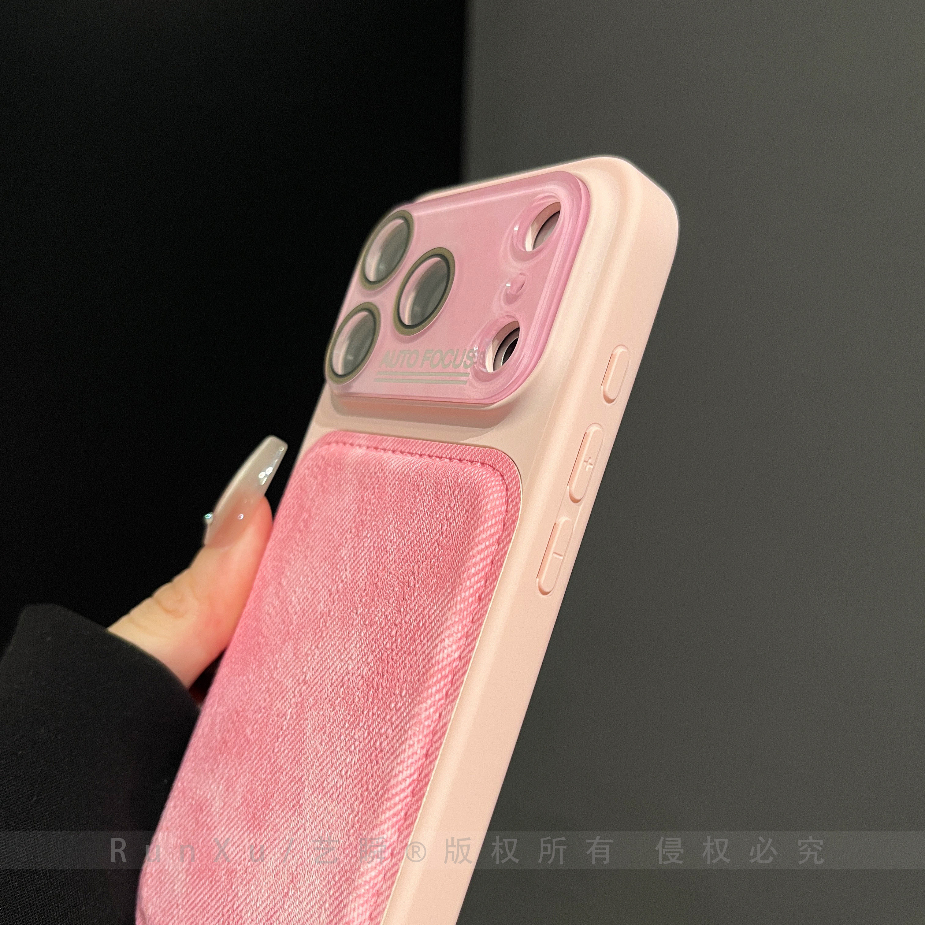 粉色鼓包牛仔布鎏金大视窗适用iPhone17ProMax手机壳苹果16自带镜头膜15高级女款pro按键全包14防摔17保护套