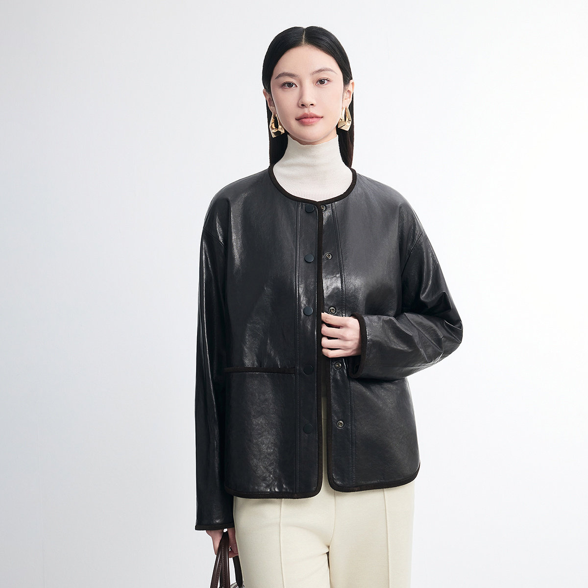 FINITY菲妮迪真皮皮衣2026春新款灰色羊皮革轻奢短款修身外套女装
