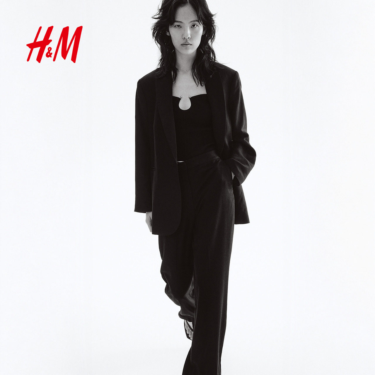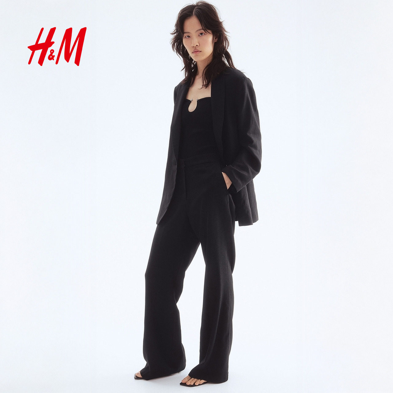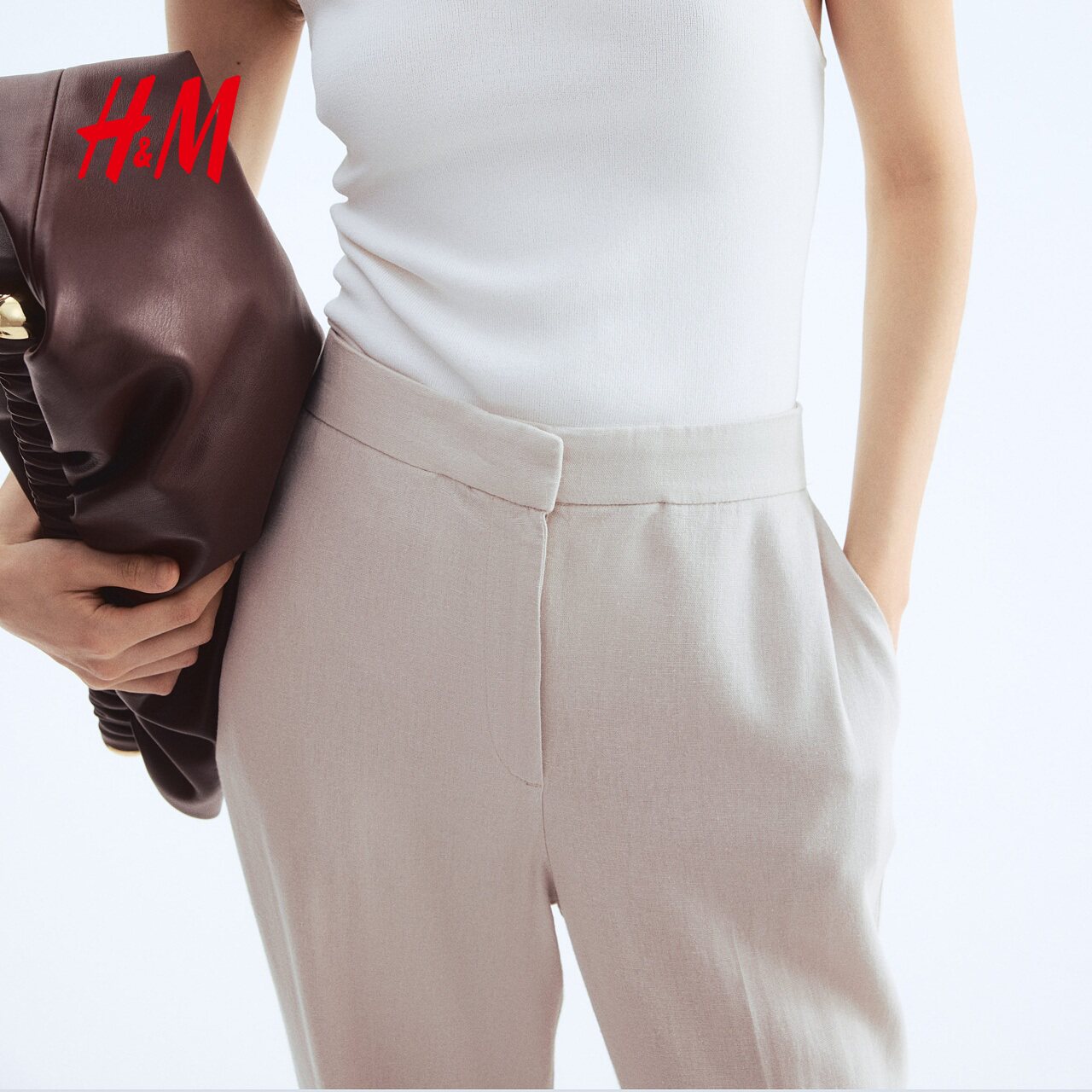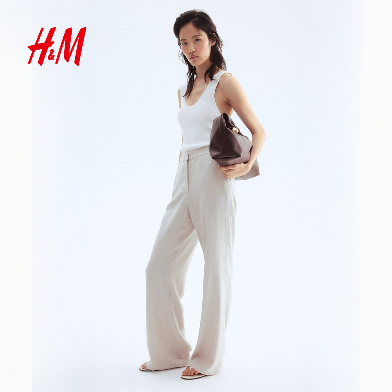 HM女装休闲裤春季亚麻混纺微喇长裤1293464